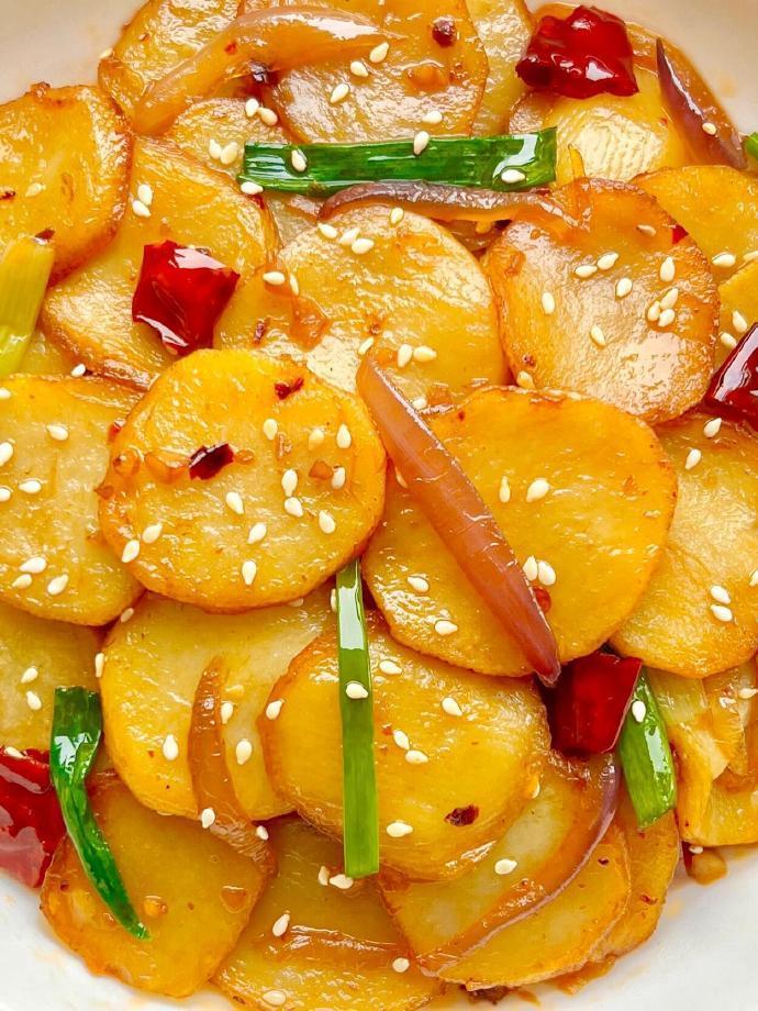 Stir-fried Potatoes | ["potatoes","onions","green onions","sesame seeds","chili peppers"] | ["potatoes:300g","onions:50g","green onions:20g","sesame seeds:5g"] | |
