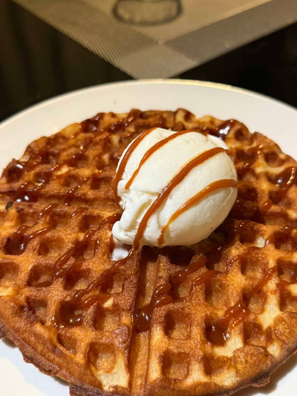 Waffle with Ice Cream | ["waffle","ice cream","caramel sauce"] | ["waffle:200g","ice cream:50g","caramel sauce:20g"] | |