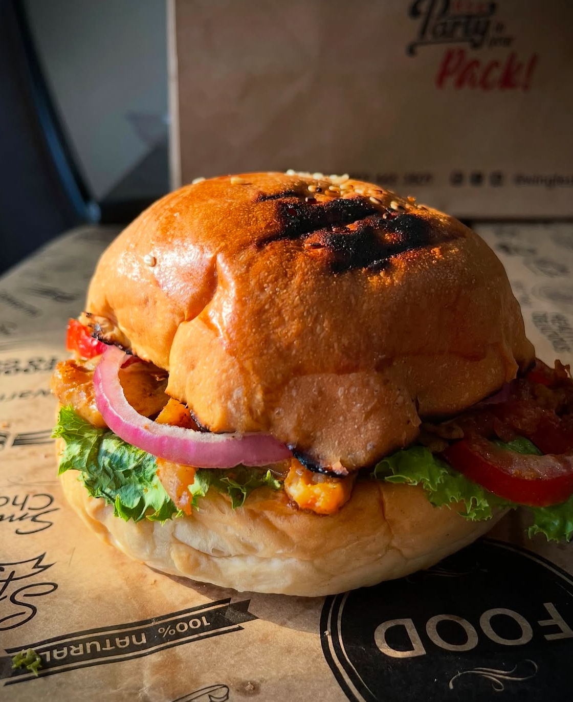 Grilled Chicken Burger | ["chicken patty","burger bun","lettuce","tomato","onion"] | ["burger:250g","lettuce:30g","tomato:20g","onion:10g"] | |