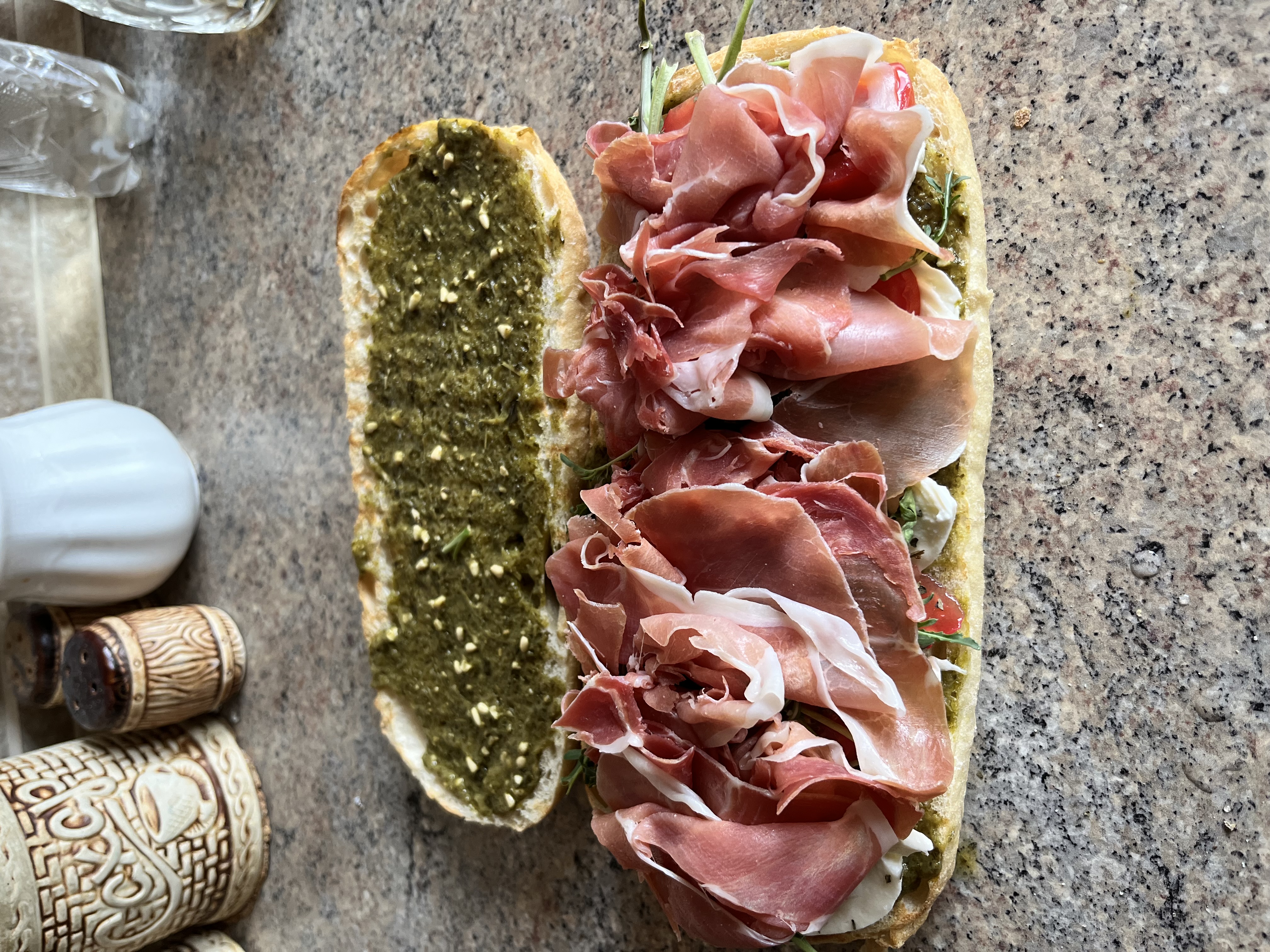 Italian Sandwich | ["bread","cured meats","cheese","pesto","vegetables"] | ["bread:200g","cured meats:150g","cheese:50g","vegetables:100g"] | |