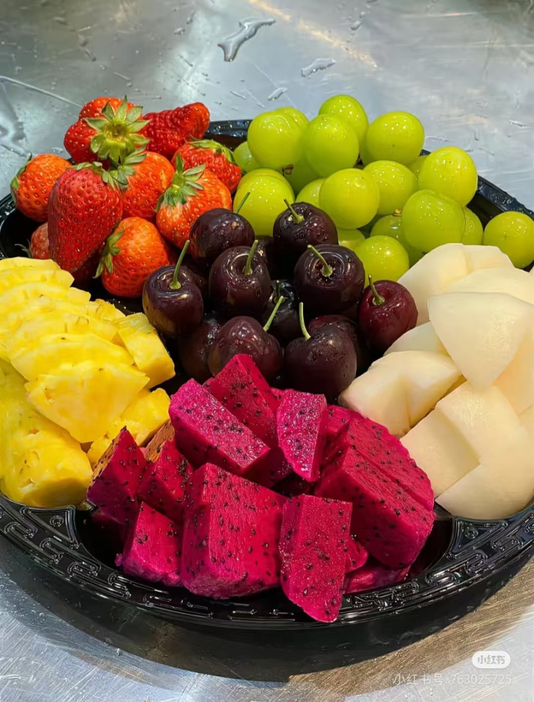 Mixed Fruit Platter | ["Strawberries","Green Grapes","Cherries","Pineapple","Dragon Fruit","Pear"] | ["Strawberries:150g","Green Grapes:100g","Cherries:100g","Pineapple:100g","Dragon Fruit:100g","Pear:100g"] | |