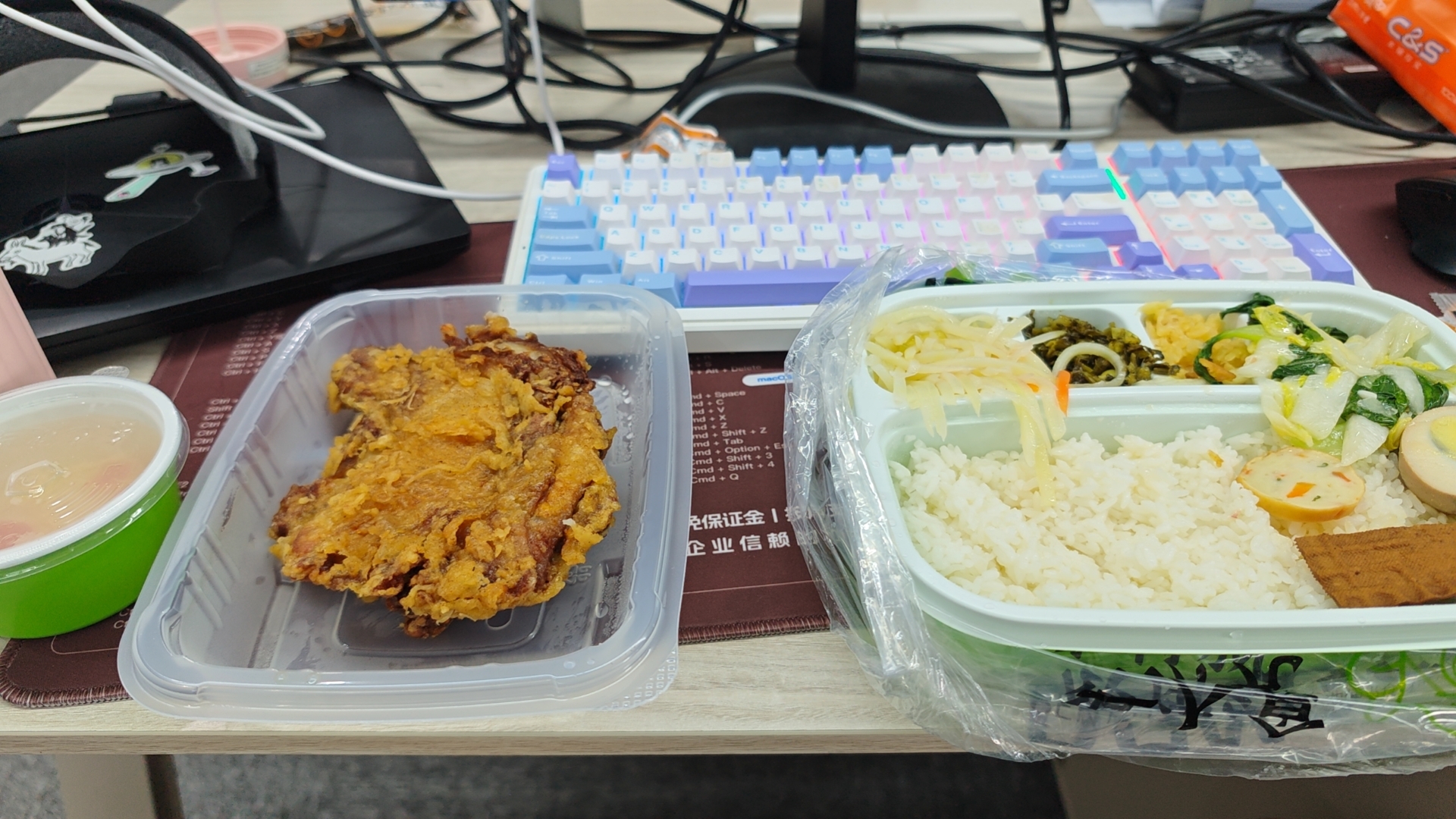 Fried Chicken with Rice | ["fried chicken","rice","mixed vegetables","sauce"] | ["fried chicken:200g","rice:150g","vegetables:100g"] | |