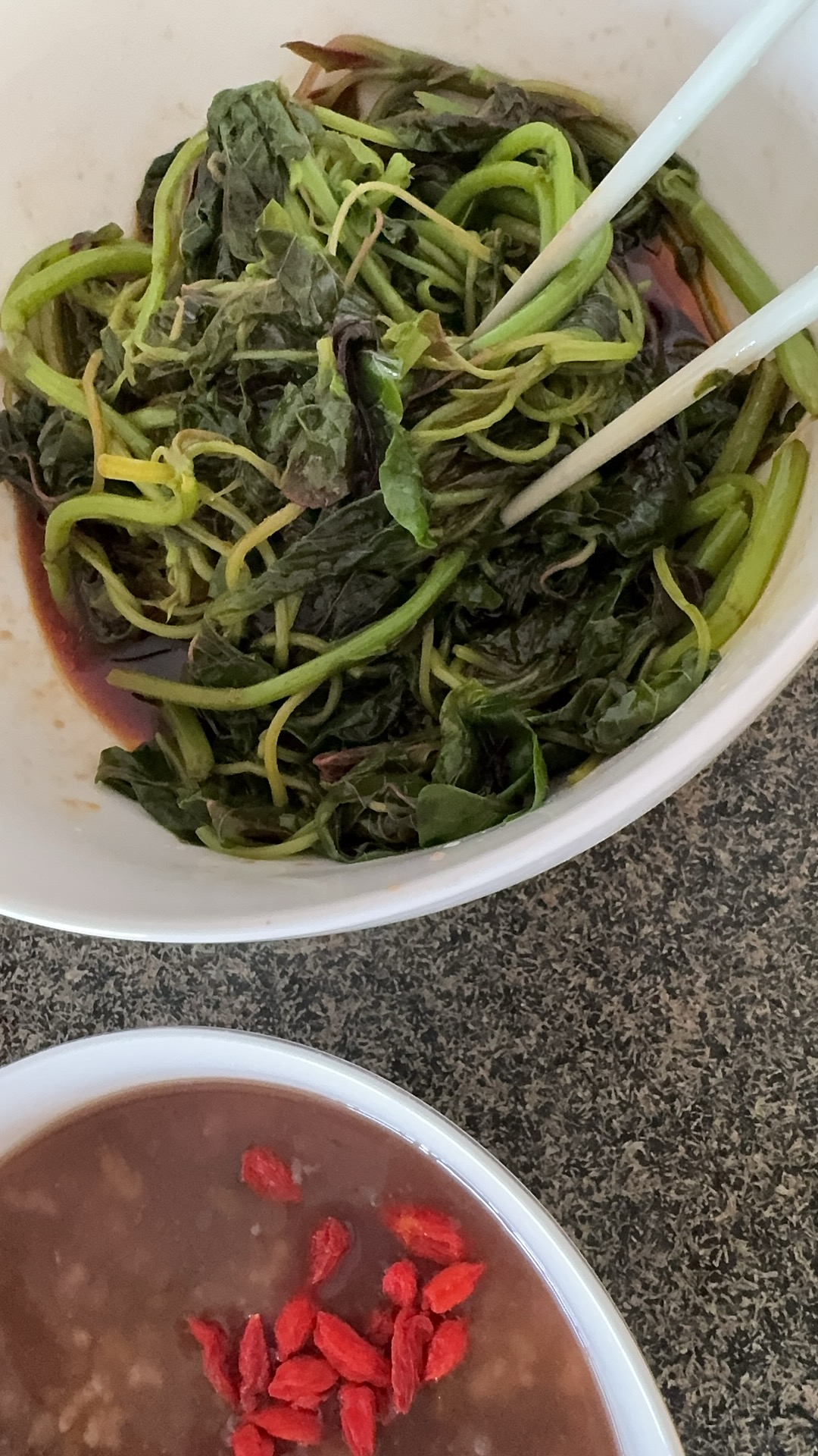 Stir-fried greens with sweet soup | ["leafy greens","sweet soup","goji berries"] | ["greens:200g","soup:150g"] | |