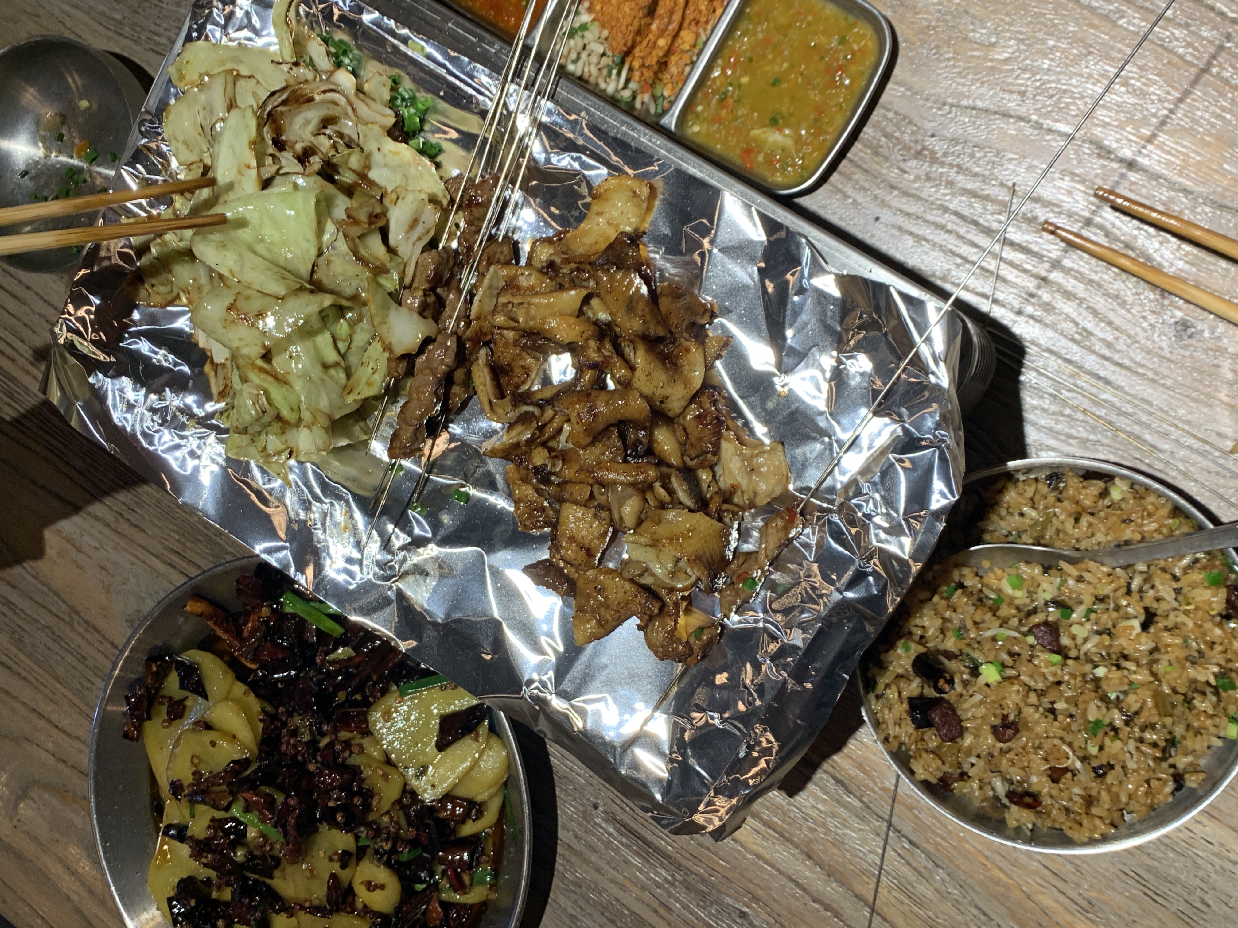 Grilled Skewers and Hot Pot | ["chicken","beef","vegetables","sauce"] | ["chicken skewers:200g","beef skewers:200g","vegetables:100g","sauce:50g"] | |