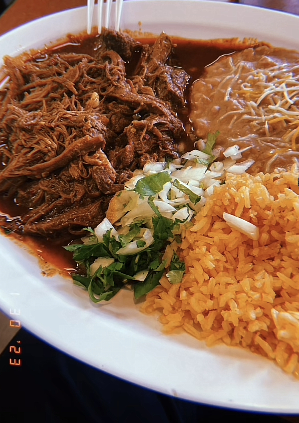 Shredded Beef Plate | ["shredded beef","rice","refried beans","cilantro","onion"] | ["shredded beef:200g","rice:150g","beans:100g","cilantro:20g"] | |