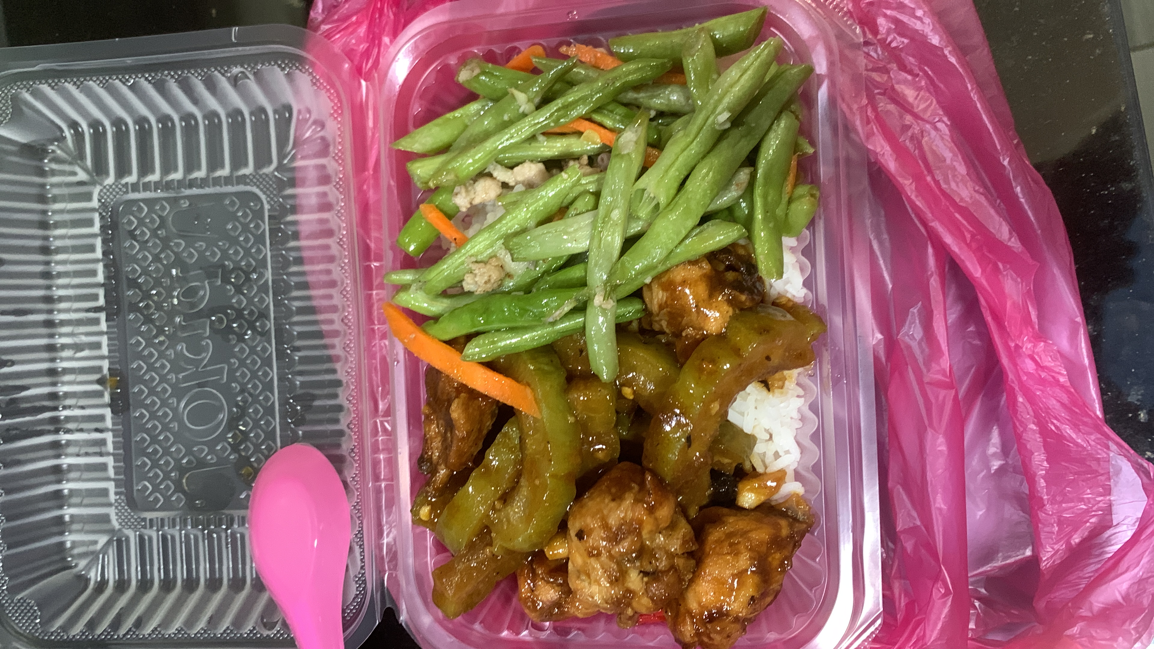 Chicken with Vegetables and Rice | ["chicken","green beans","carrots","bell peppers","rice"] | ["chicken:200g","vegetables:150g","rice:200g"] | |