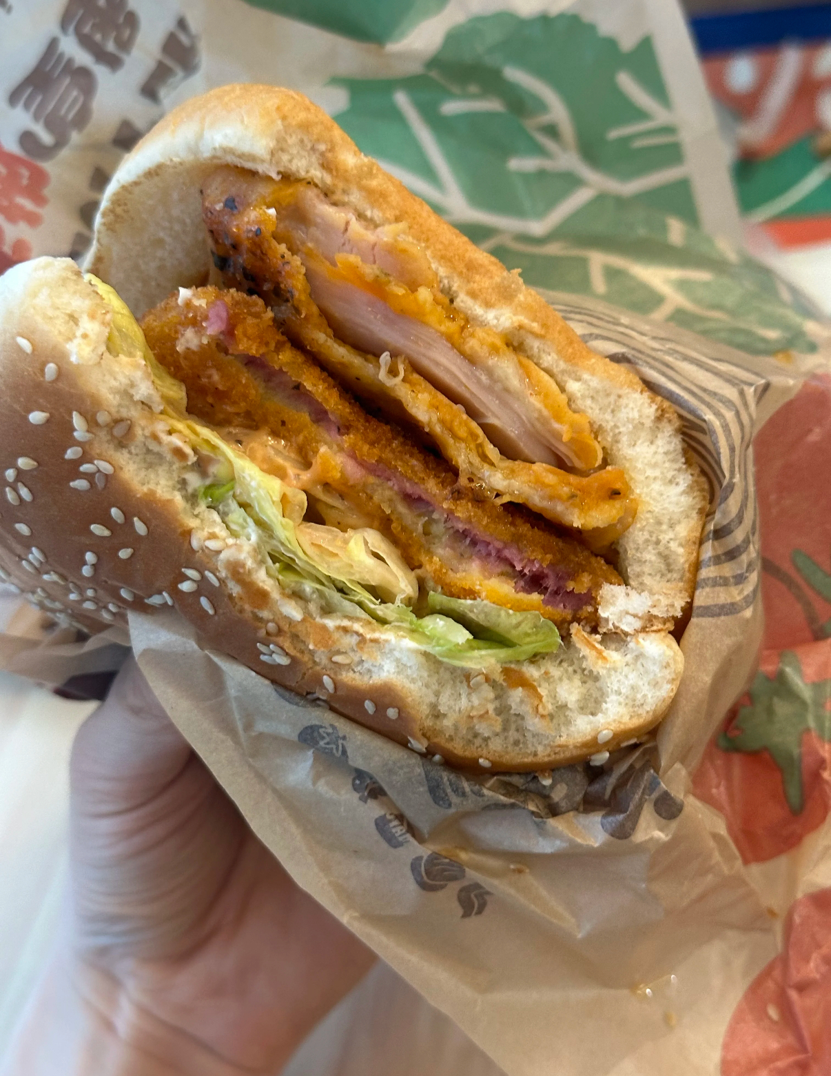 Fried Chicken Sandwich | ["fried chicken","sesame bun","lettuce","sauce"] | ["chicken:150g","bun:100g","lettuce:20g","sauce:30g"] | |