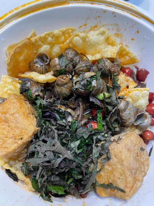 Mixed Seafood and Tofu Dish | ["snails","tofu","crispy snacks","greens"] | ["snails:200g","tofu:150g","crispy snacks:50g","greens:100g"] | |