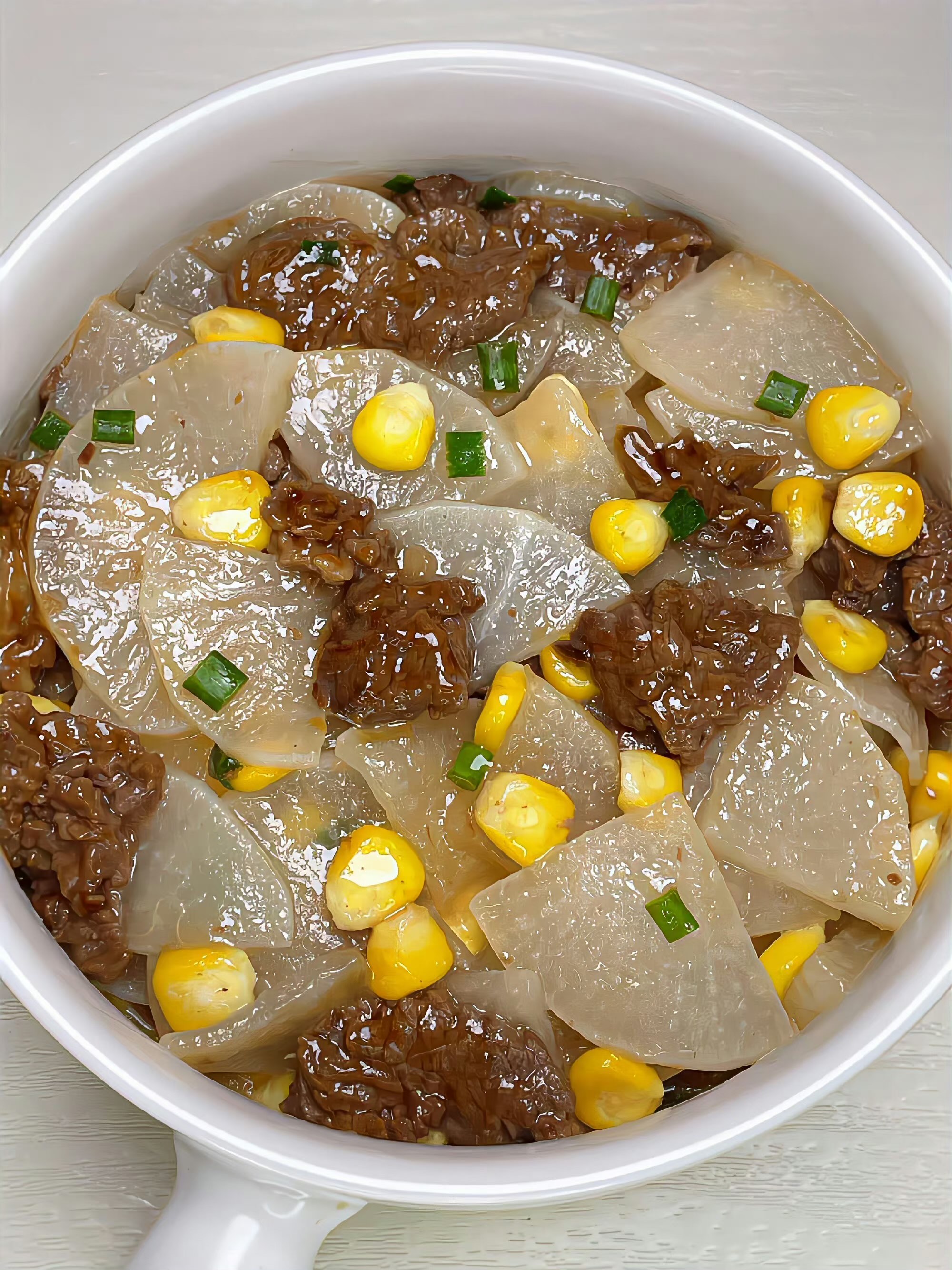 Beef and Corn Stir-fry | ["beef","corn","daikon","green onions","soy sauce"] | ["beef:200g","corn:100g","vegetables:150g"] | |