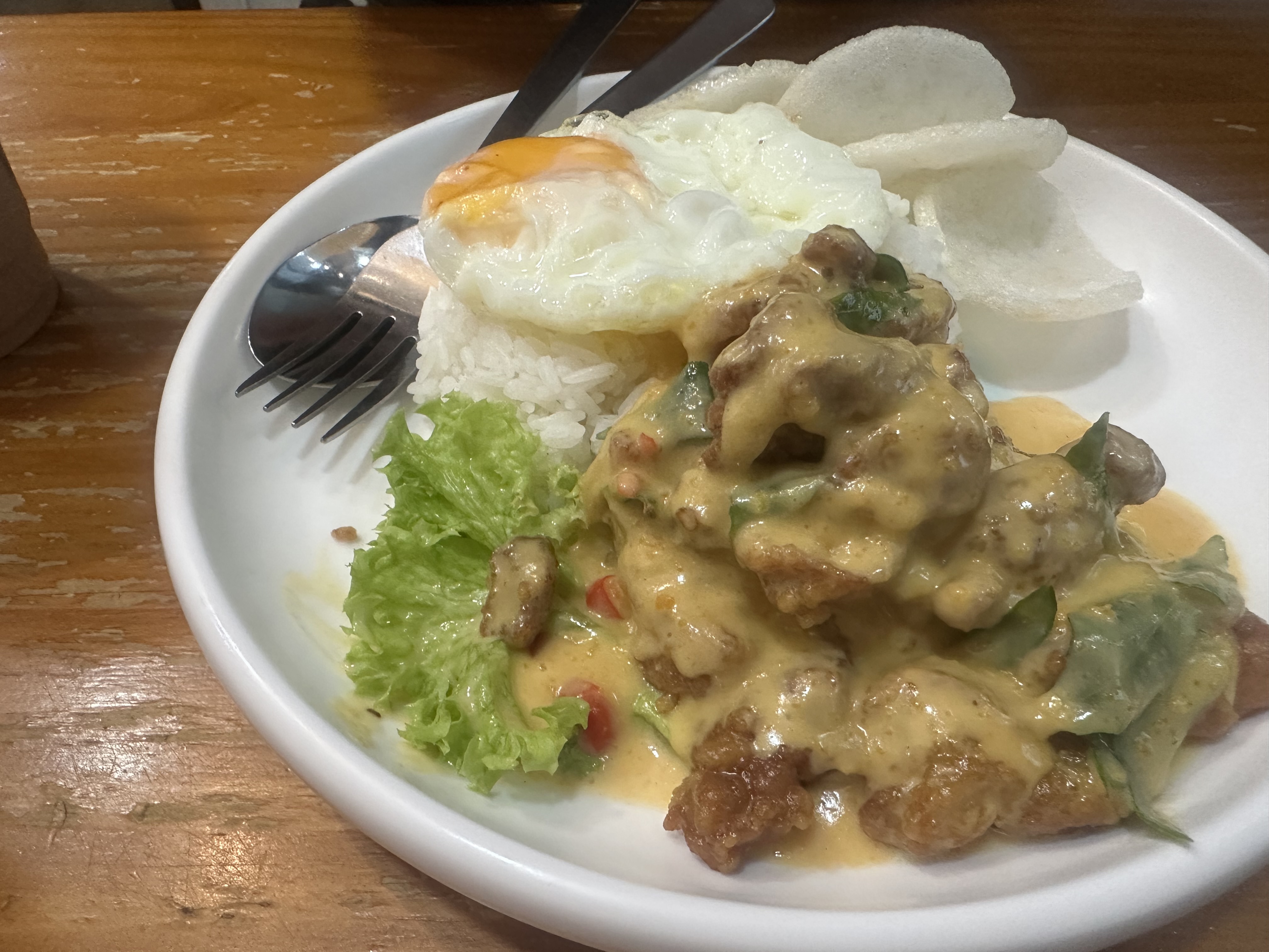Fried Chicken with Rice | ["fried chicken","rice","fried egg","lettuce","sauce"] | ["fried chicken:200g","rice:150g","fried egg:50g","salad:50g"] | |