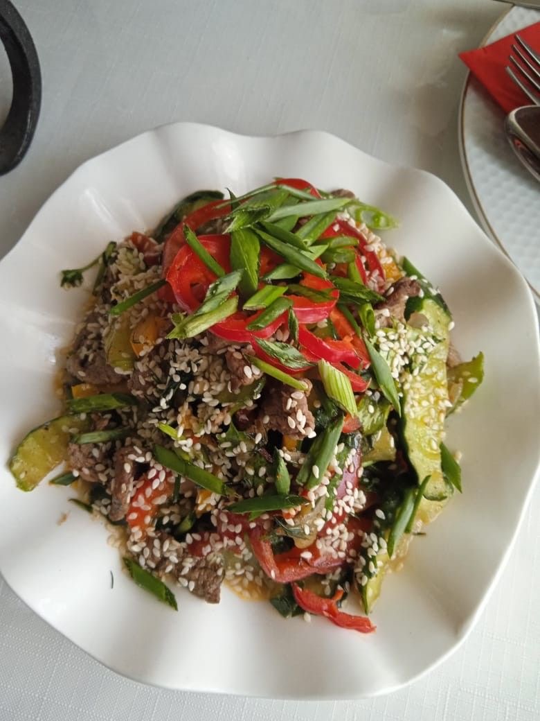 Beef Stir-Fry | ["beef","bell peppers","green onions","sesame seeds","soy sauce"] | ["beef:200g","vegetables:150g","sesame seeds:10g"] | |