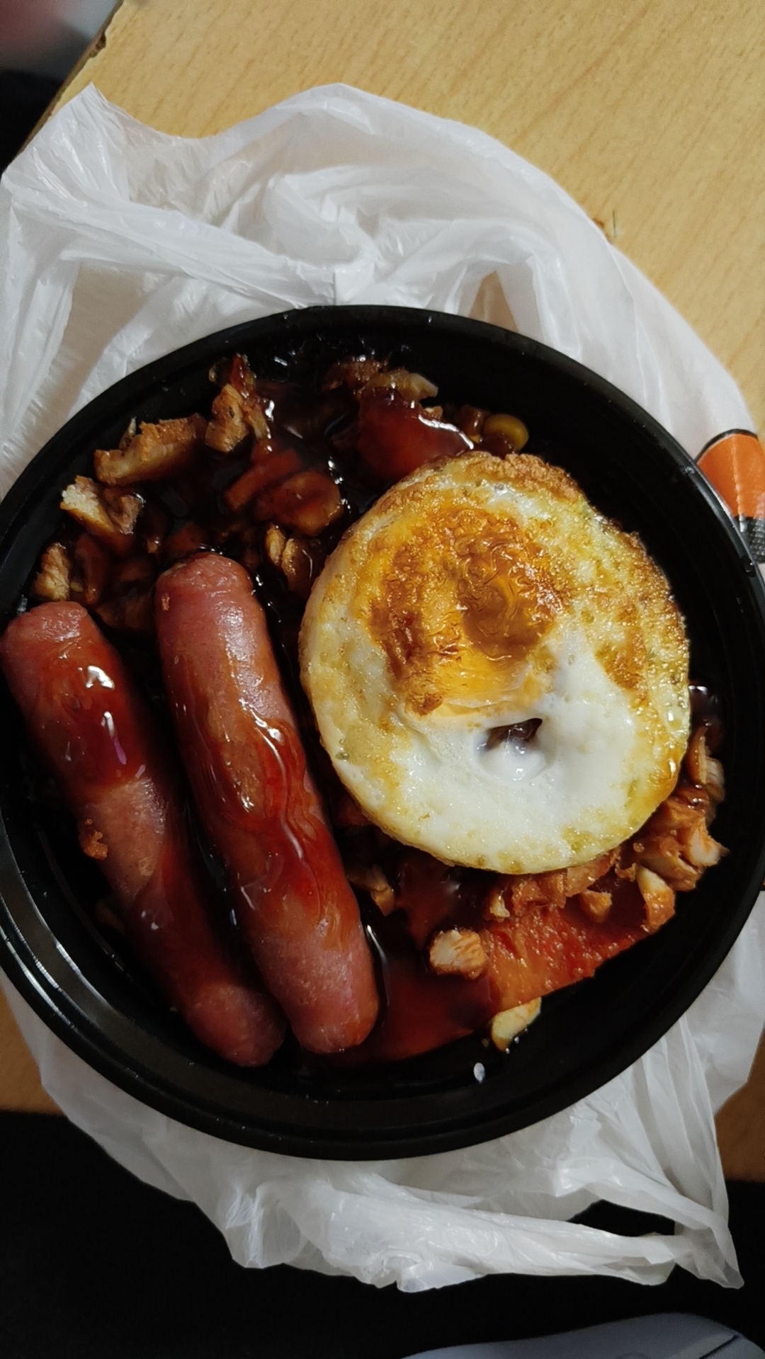 Sausage and Egg Bowl | ["sausages","egg","chicken","sauce"] | ["sausages:200g","egg:50g","other ingredients:100g"] | |