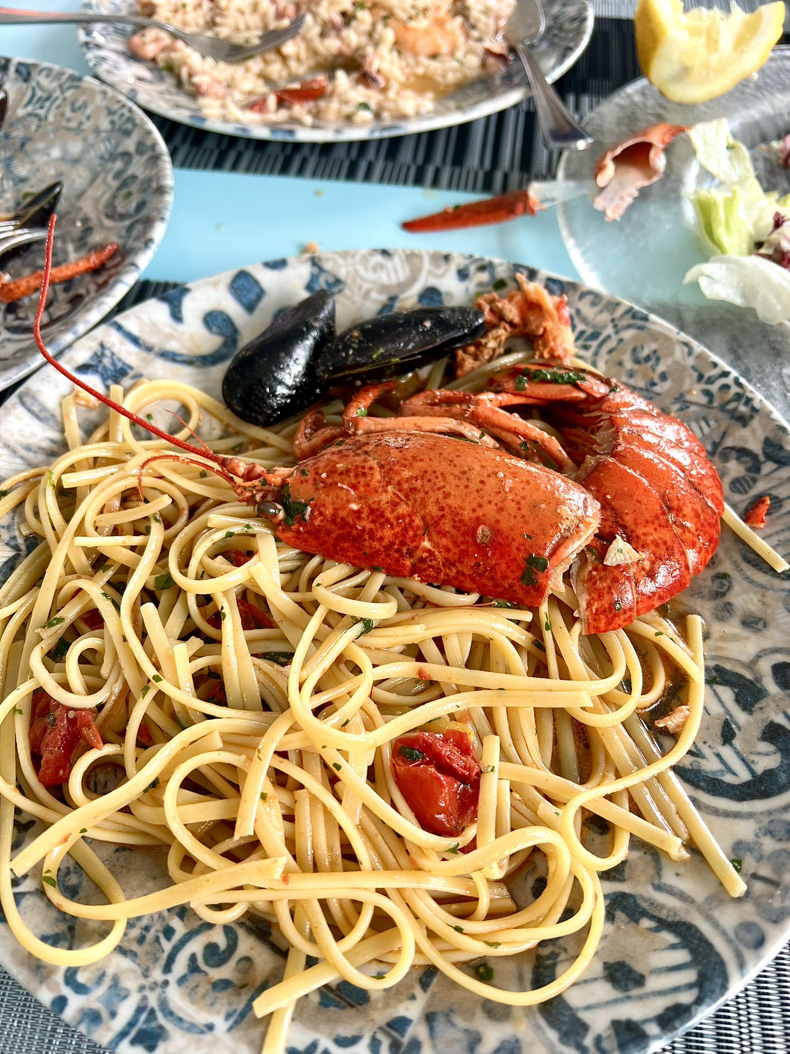 Lobster Linguine | ["pasta","lobster","mussels","tomatoes","herbs"] | ["pasta:200g","lobster:150g","mussels:100g"] | |
