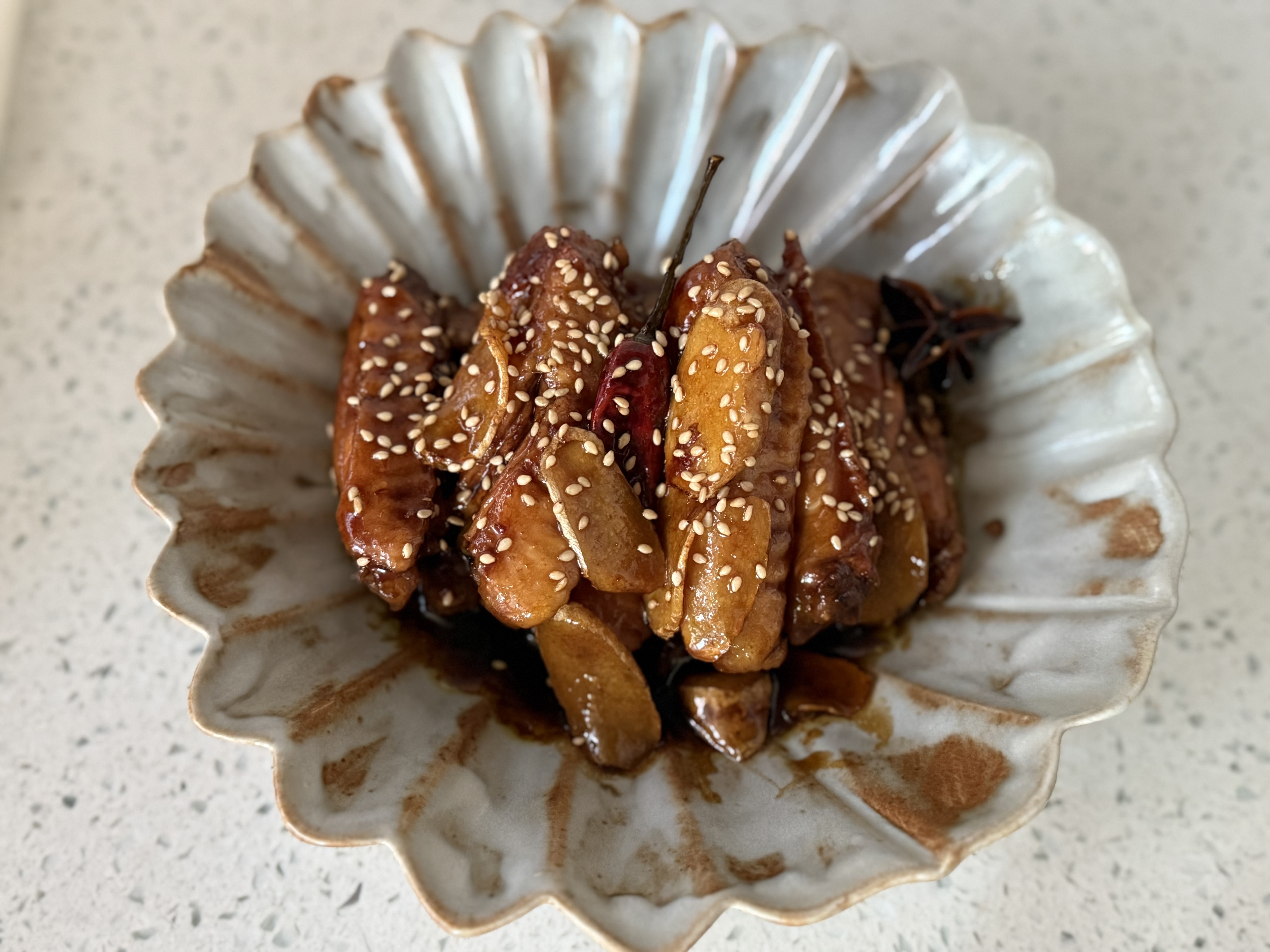 Sweet and Sour Chicken | ["chicken","soy sauce","sesame seeds","spices"] | ["chicken:200g","sauce:50g"] | |