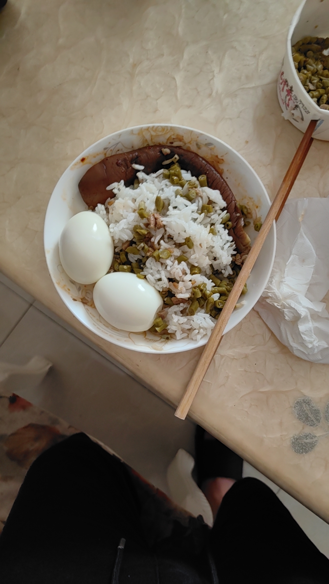 Rice with Eggs and Vegetables | ["rice","boiled eggs","green beans","meat"] | ["rice:300g","eggs:100g","vegetables:50g"] | |