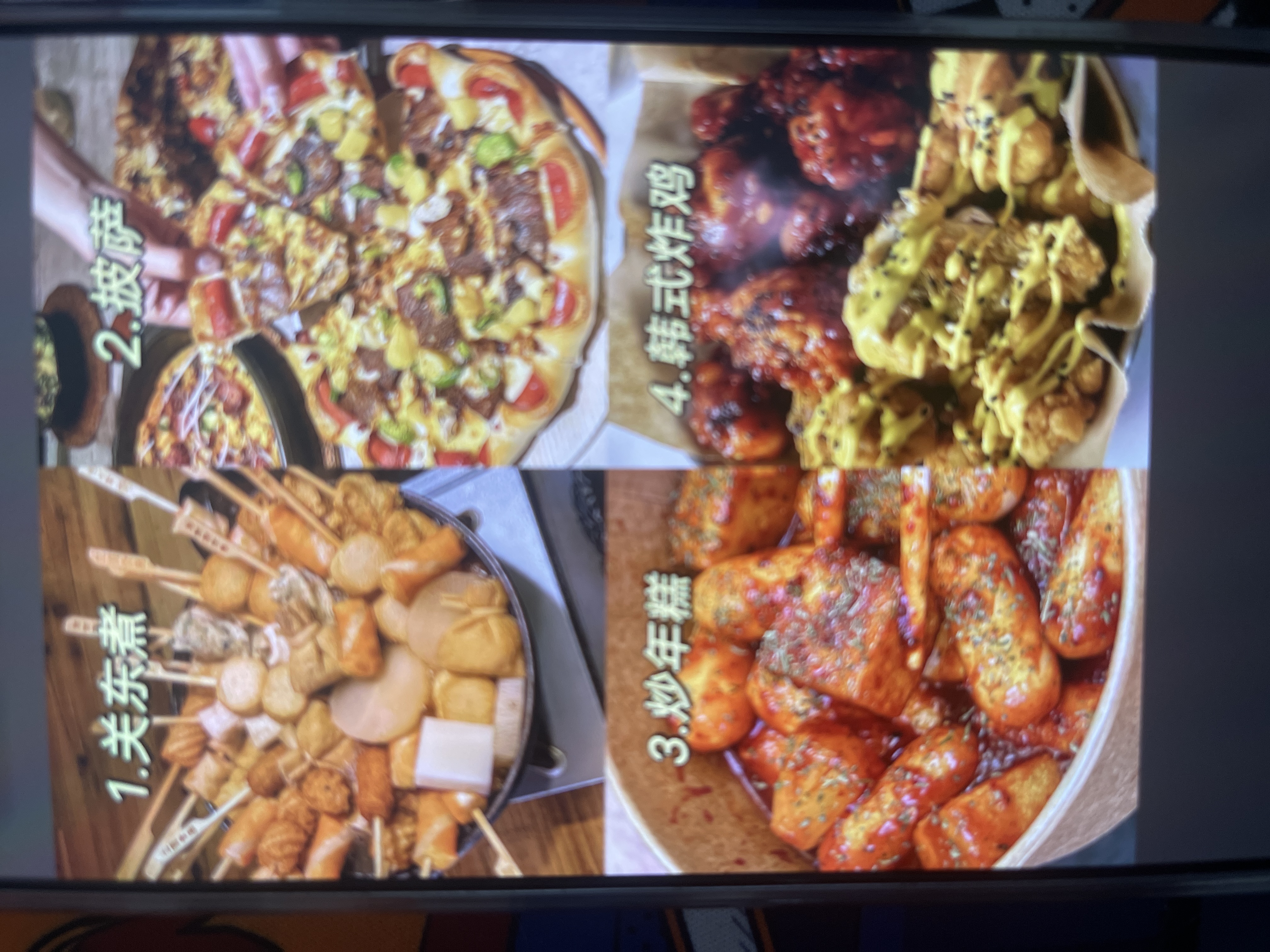 Mixed Asian Dishes | ["skewered fish cakes","pizza","spicy rice cakes","fried chicken"] | ["skewered items:500g","pizza:300g","spicy rice cakes:200g","fried chicken:200g"] | |