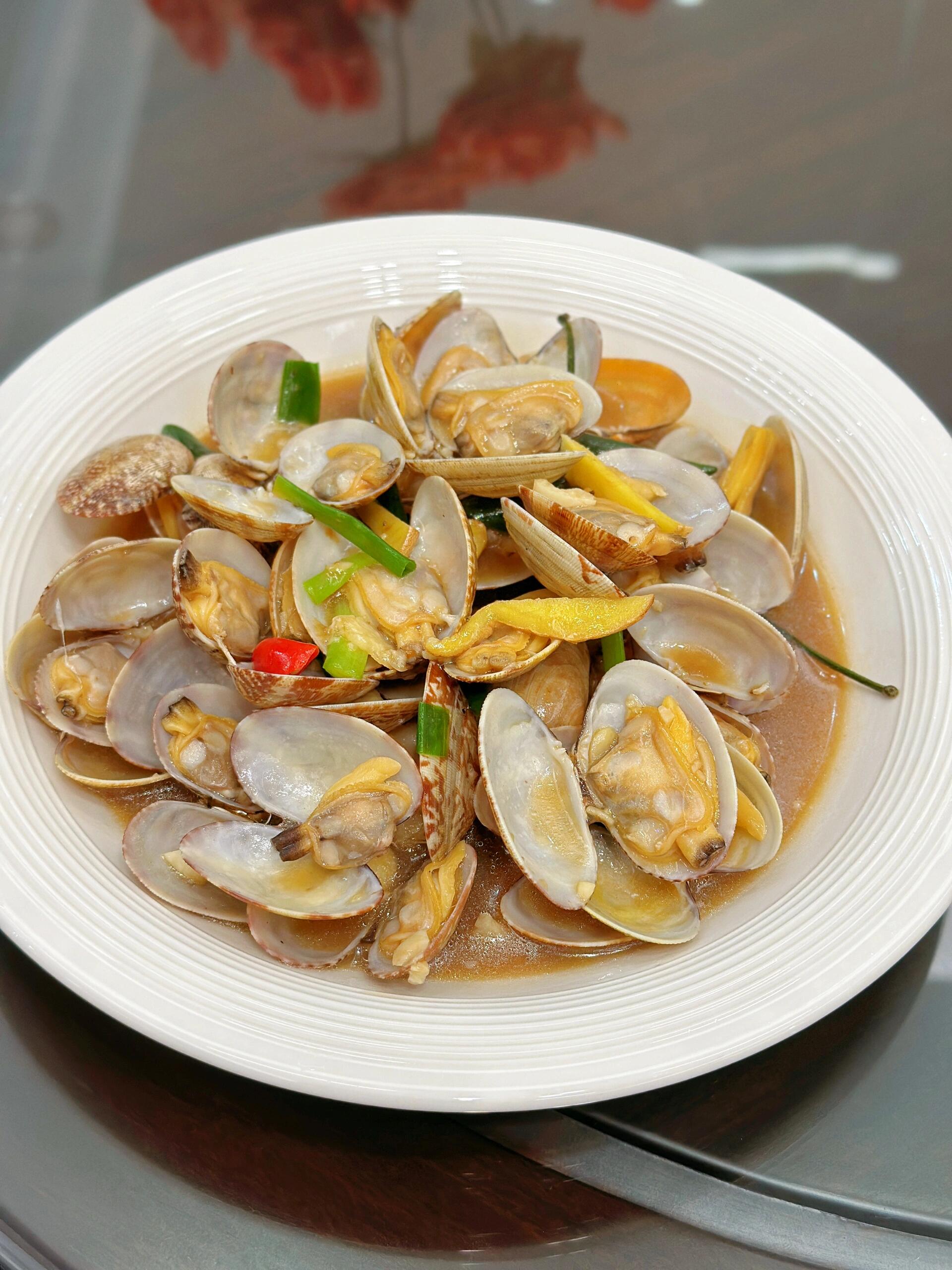 Steamed Clams | ["clams","garlic","ginger","green onions","sauce"] | ["clams:300g","sauce:50g"] | |