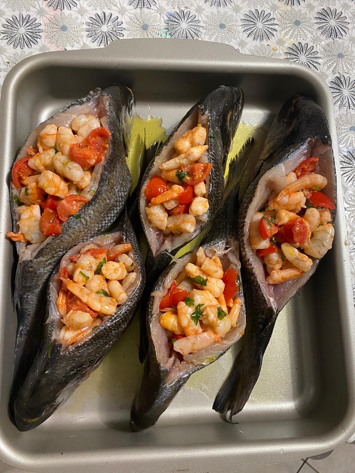 Stuffed Fish with Shrimp | ["fish","shrimp","tomatoes","cilantro"] | ["fish:300g","shrimp:100g","tomatoes:50g"] | |