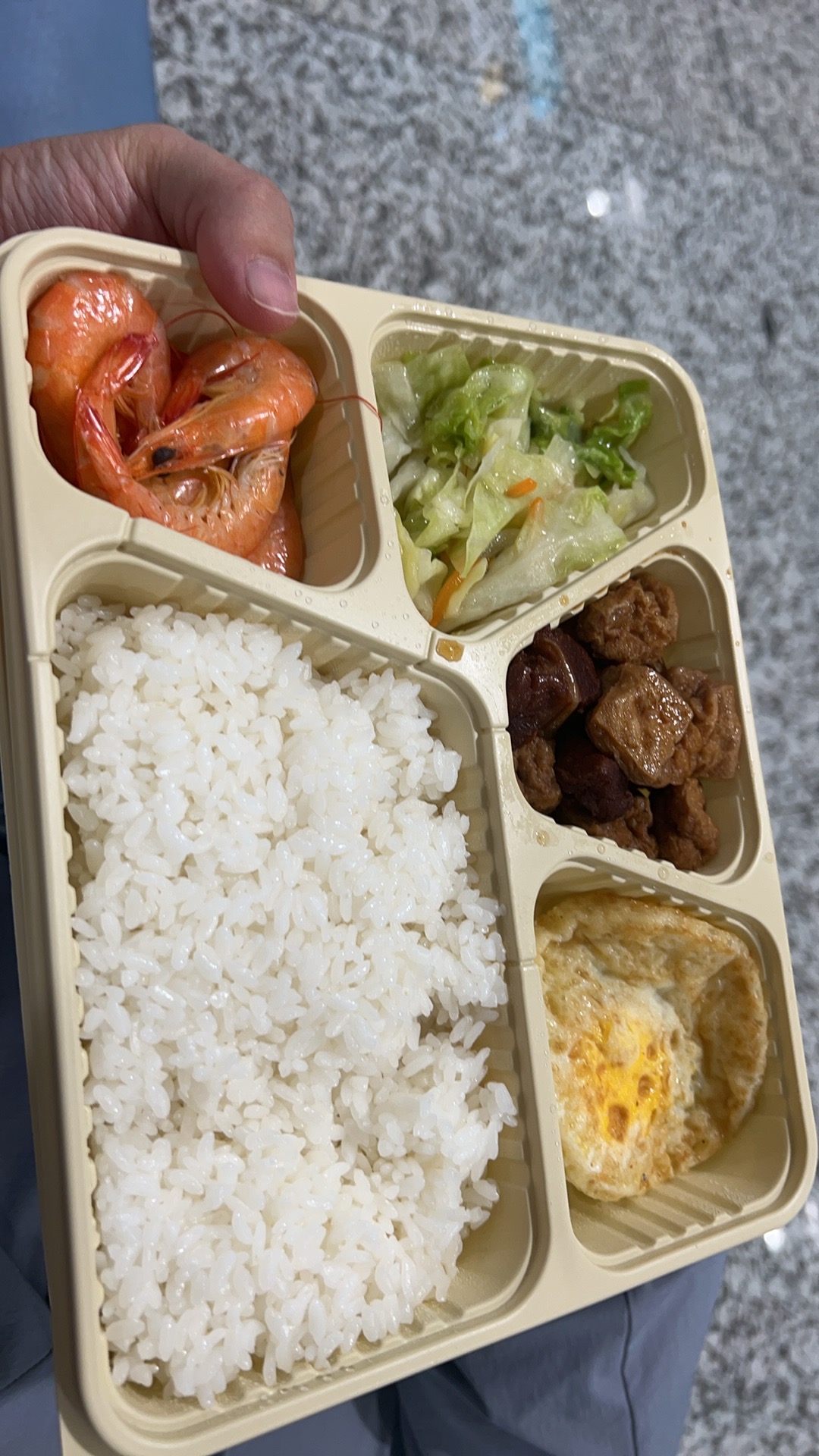 Shrimp and Rice Meal | ["shrimp","rice","cabbage","egg","beef"] | ["shrimp:150g","rice:200g","vegetables:100g","egg:50g"] | |