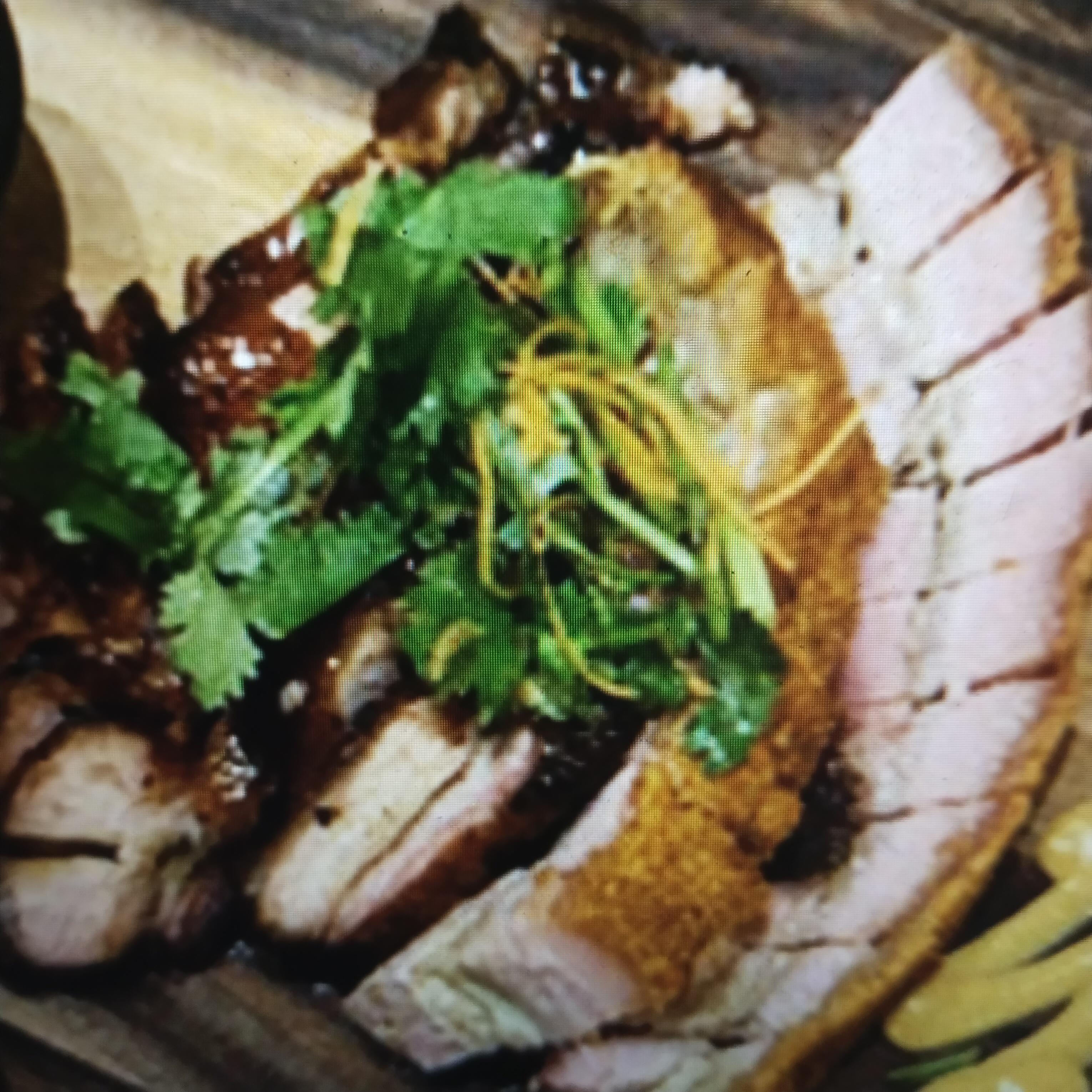 Roast Meat | ["pork","cilantro","spices"] | ["meat:300g","garnish:50g"] | |