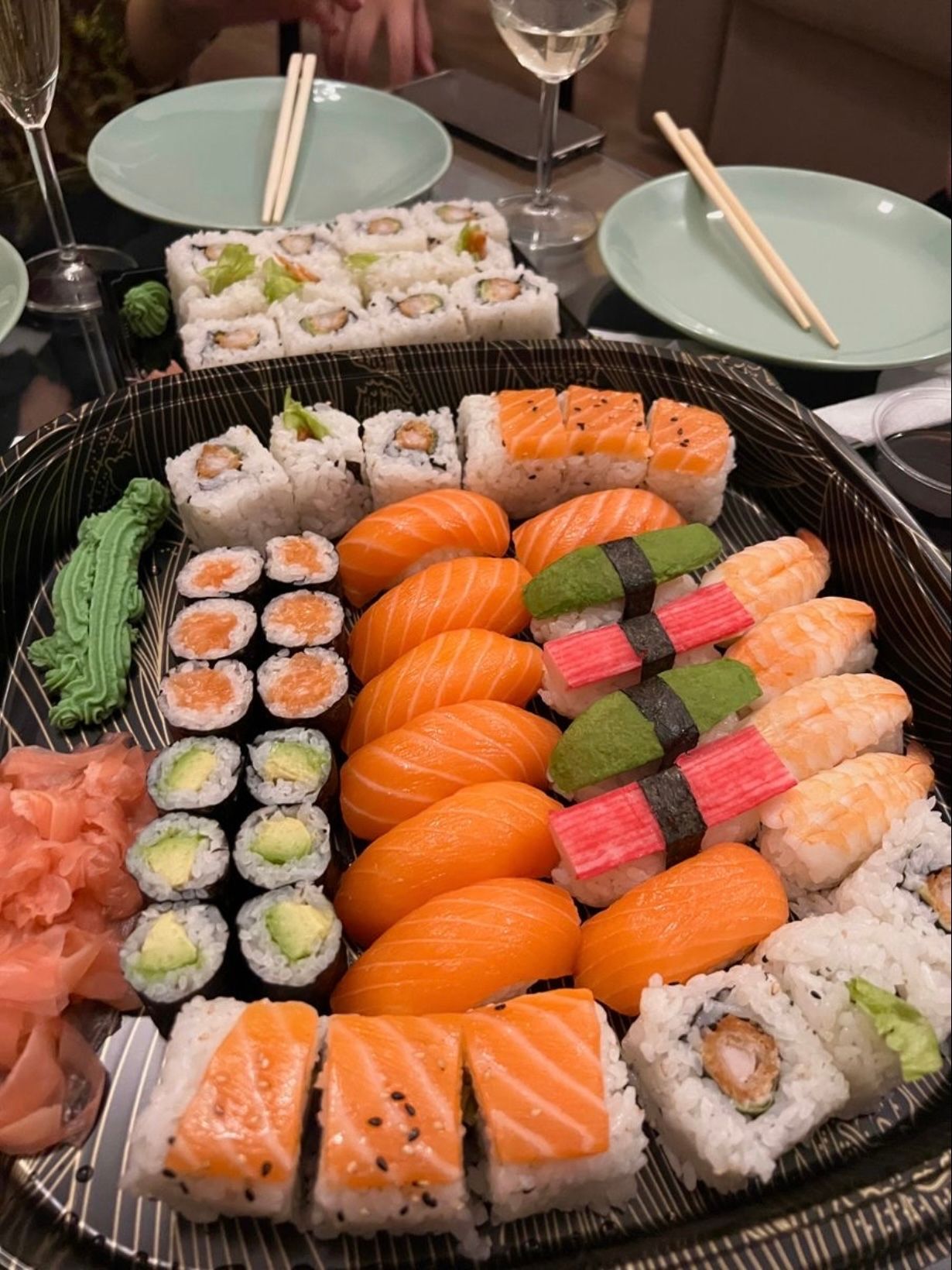 Sushi Platter | ["sushi rice","salmon","crab sticks","avocado","seaweed","wasabi","ginger"] | ["sushi:500g"] | |