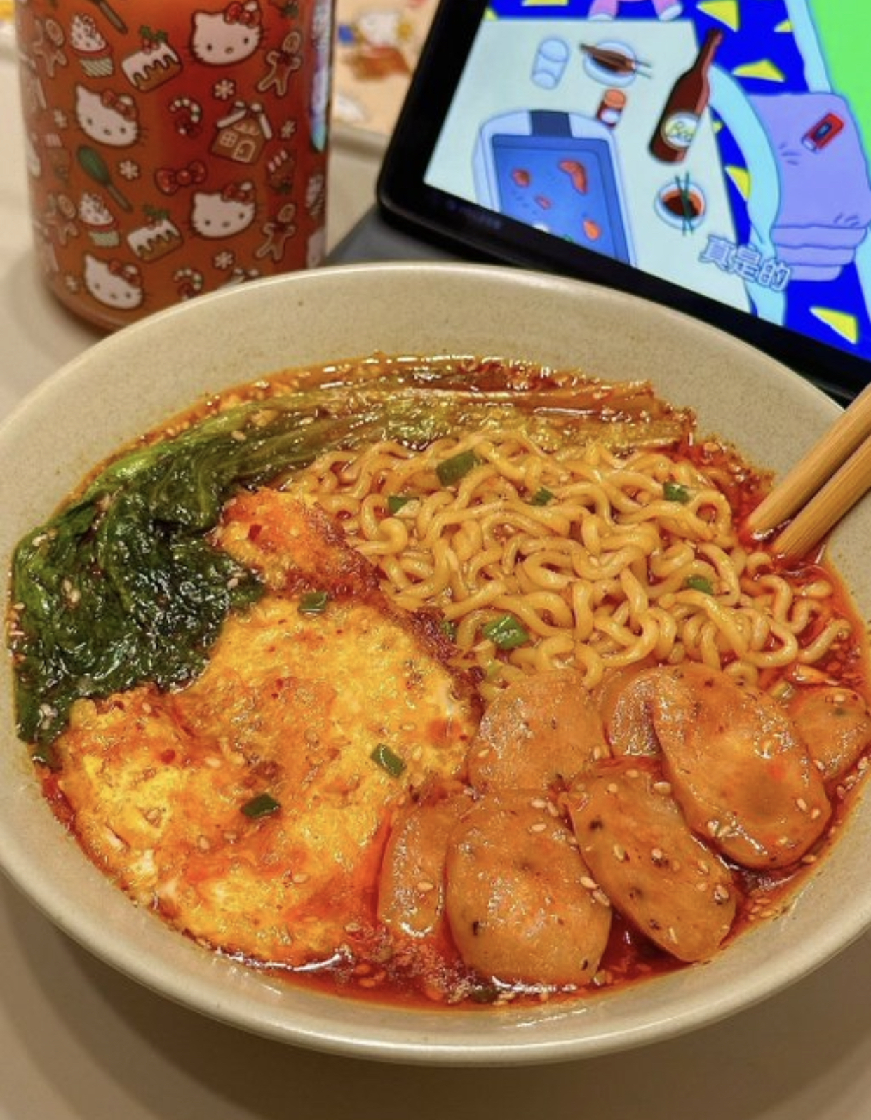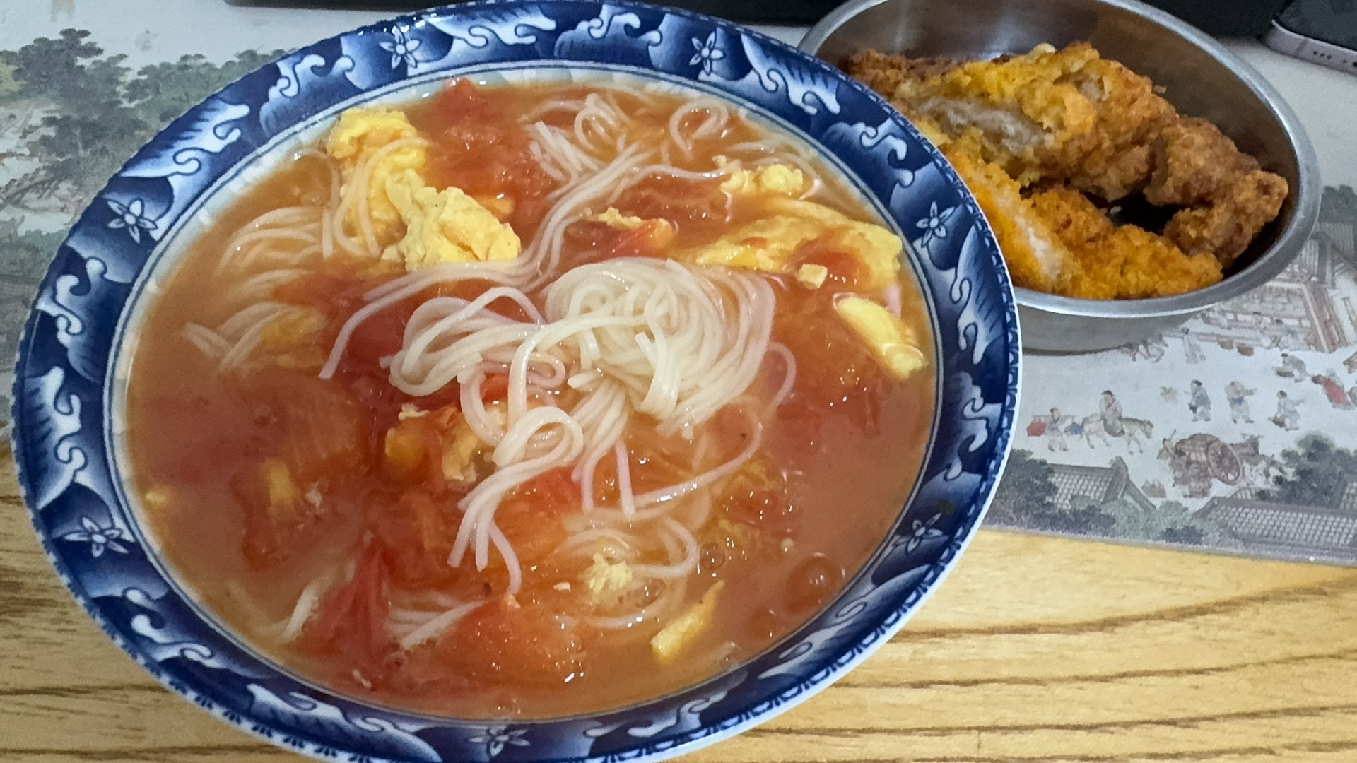 Noodle Soup with Fried Chicken | ["noodles","eggs","fried chicken","tomatoes"] | ["noodles:200g","eggs:100g","fried chicken:150g","tomatoes:50g"] | |