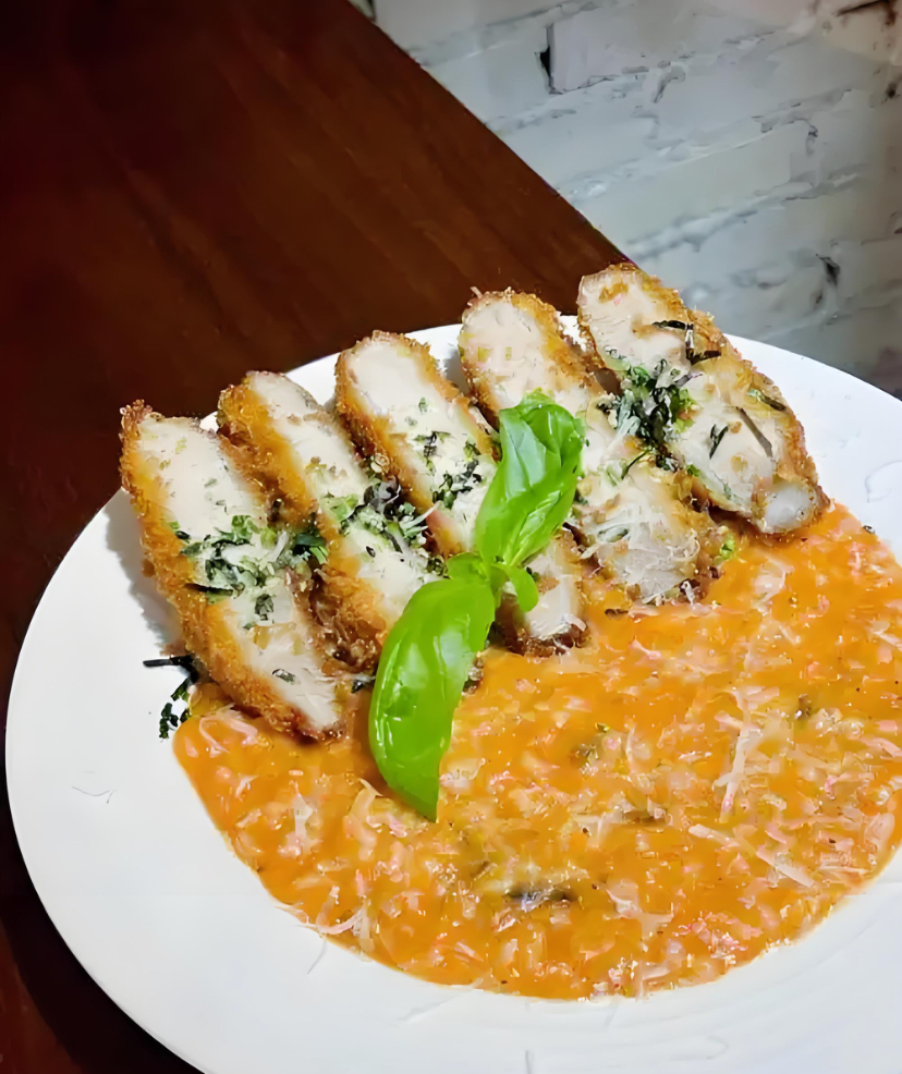 Crispy Chicken with Tomato Sauce | ["chicken","bread crumbs","tomato sauce","basil"] | ["chicken:250g","sauce:150g"] | |