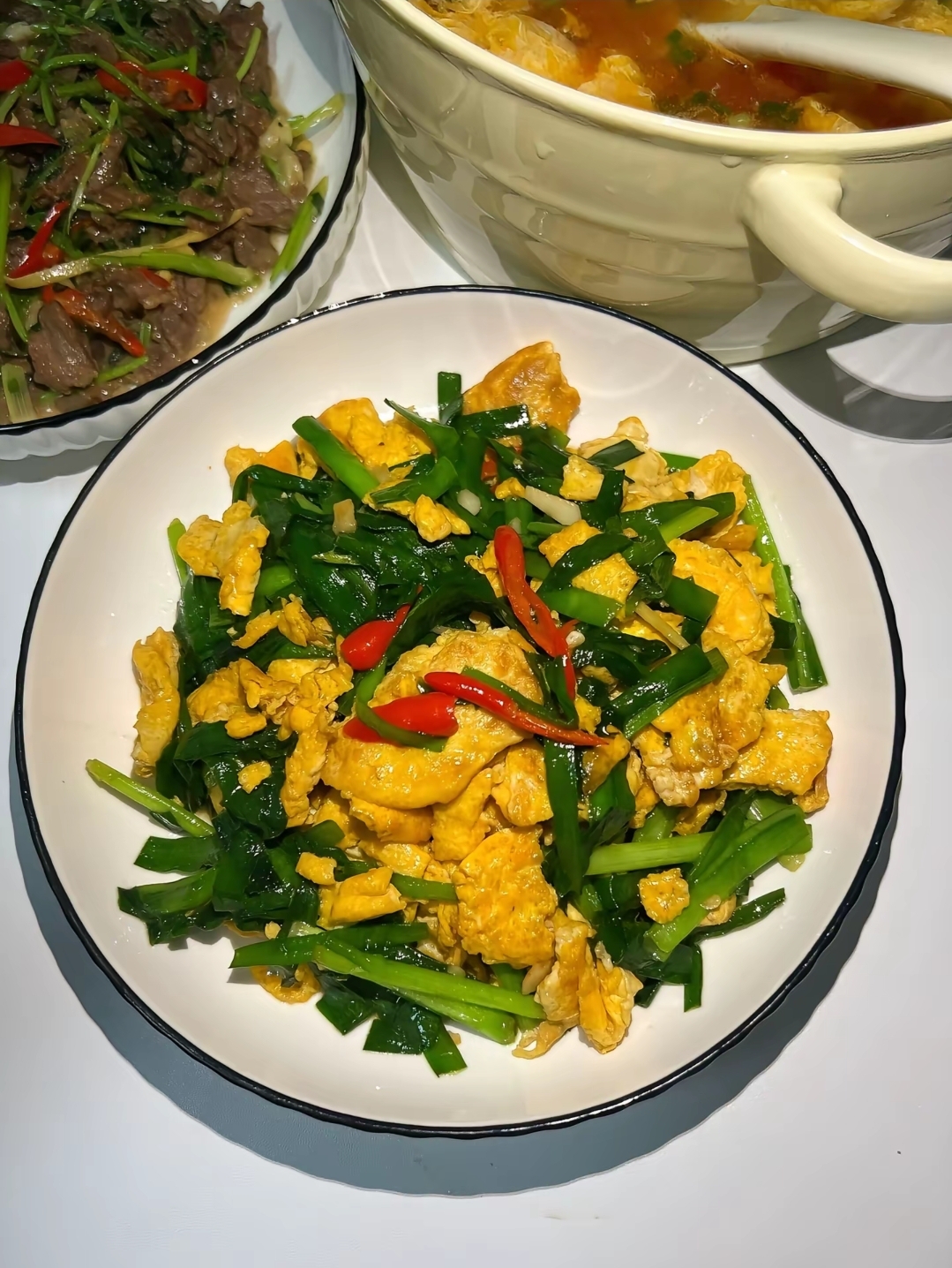 Stir-fried Eggs with Greens | ["eggs","green onions","red chili"] | ["eggs:200g","greens:150g"] | |