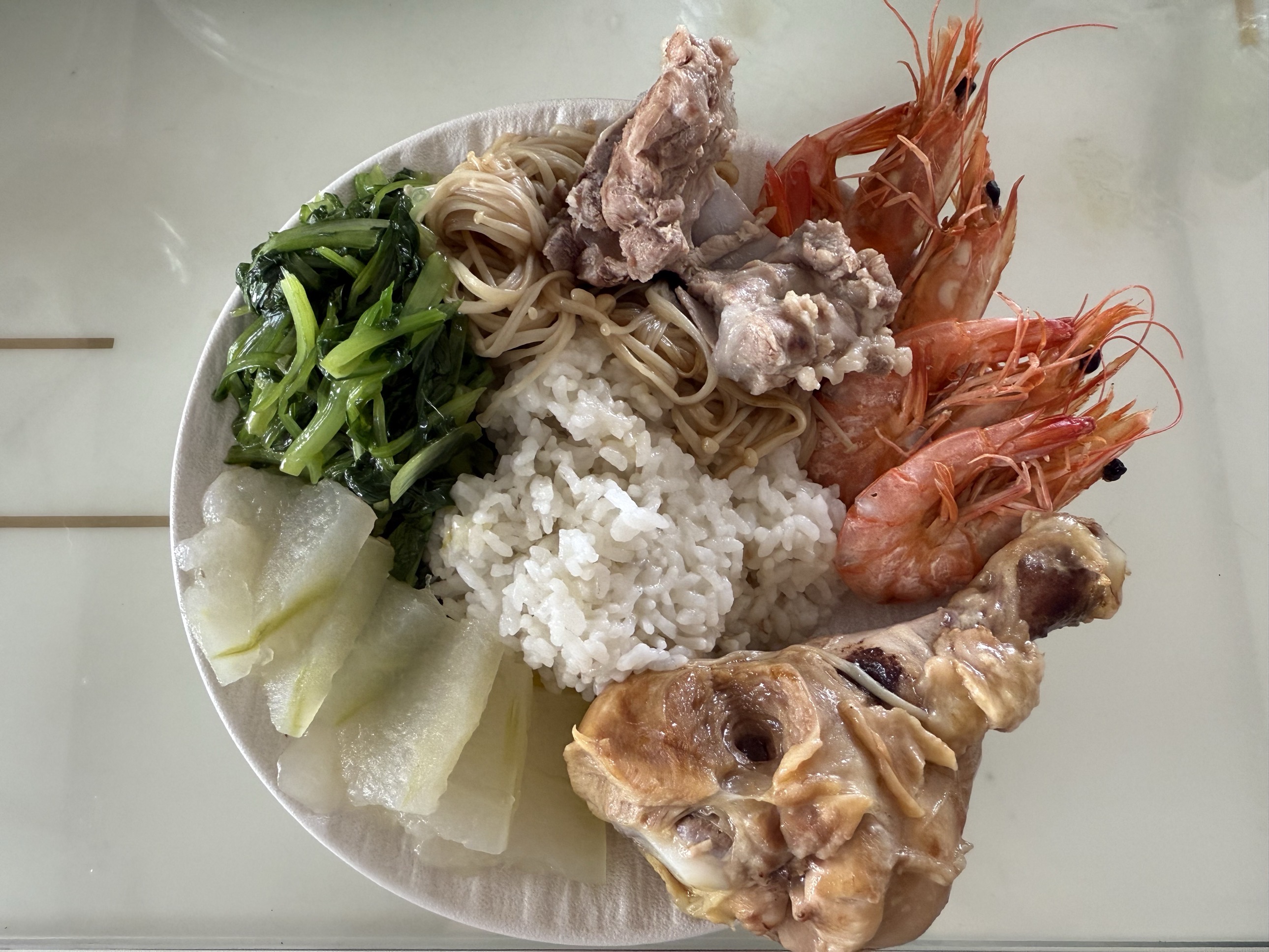 Mixed Seafood and Rice Plate | ["rice","shrimp","chicken","vegetables"] | ["rice:200g","shrimp:150g","meat:100g","vegetables:100g"] | |