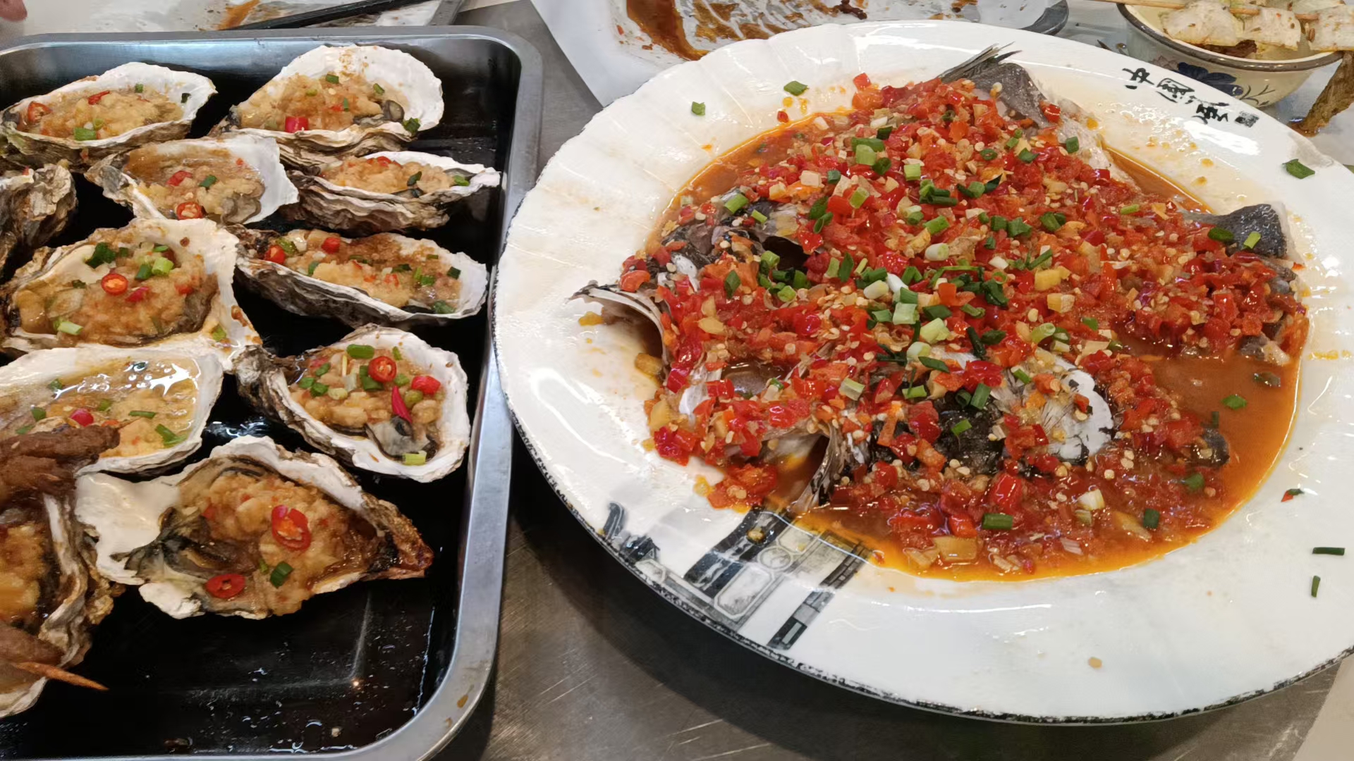 Stuffed Oysters and Spicy Fish | ["oysters","fish","spices","vegetables","sauce"] | ["oysters:300g","fish:500g"] | |