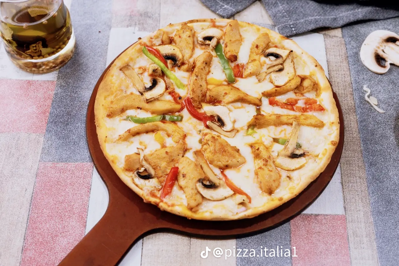 Chicken Pizza | ["pizza dough","chicken","cheese","bell peppers","mushrooms"] | ["pizza:300g"] | |