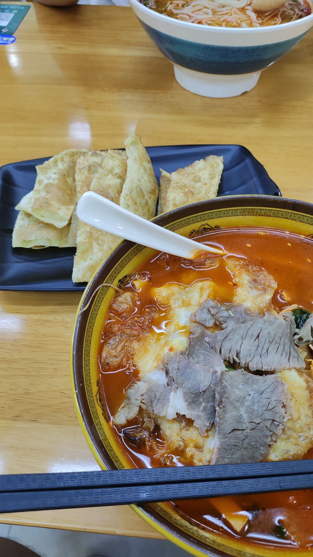 Noodle Soup with Fried Dumplings | ["noodles","beef","broth","fried dumplings"] | ["noodles:300g","meat:100g","fried dumplings:150g"] | |