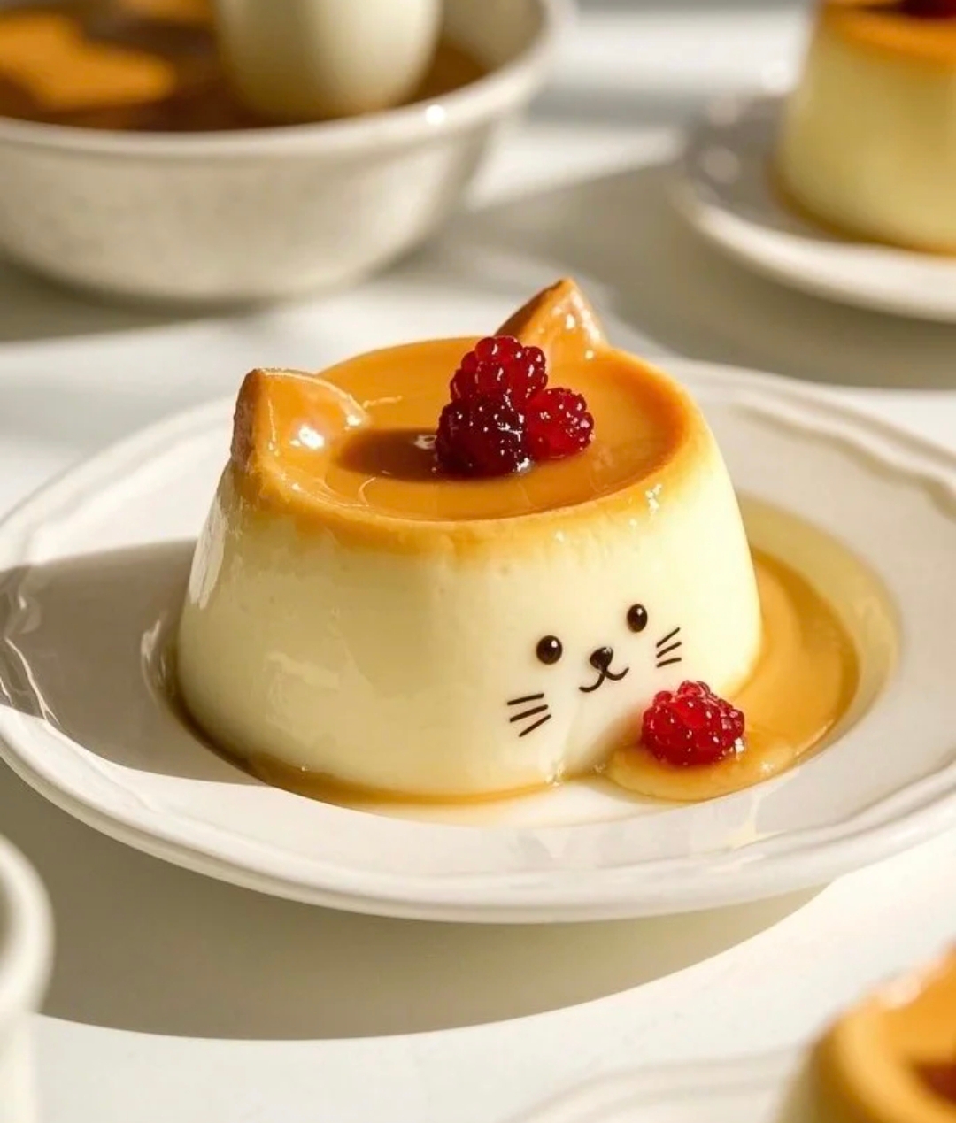 Cat-shaped Panna Cotta | ["cream","sugar","gelatin","vanilla","raspberries"] | ["panna cotta:150g","raspberries:20g"] | |