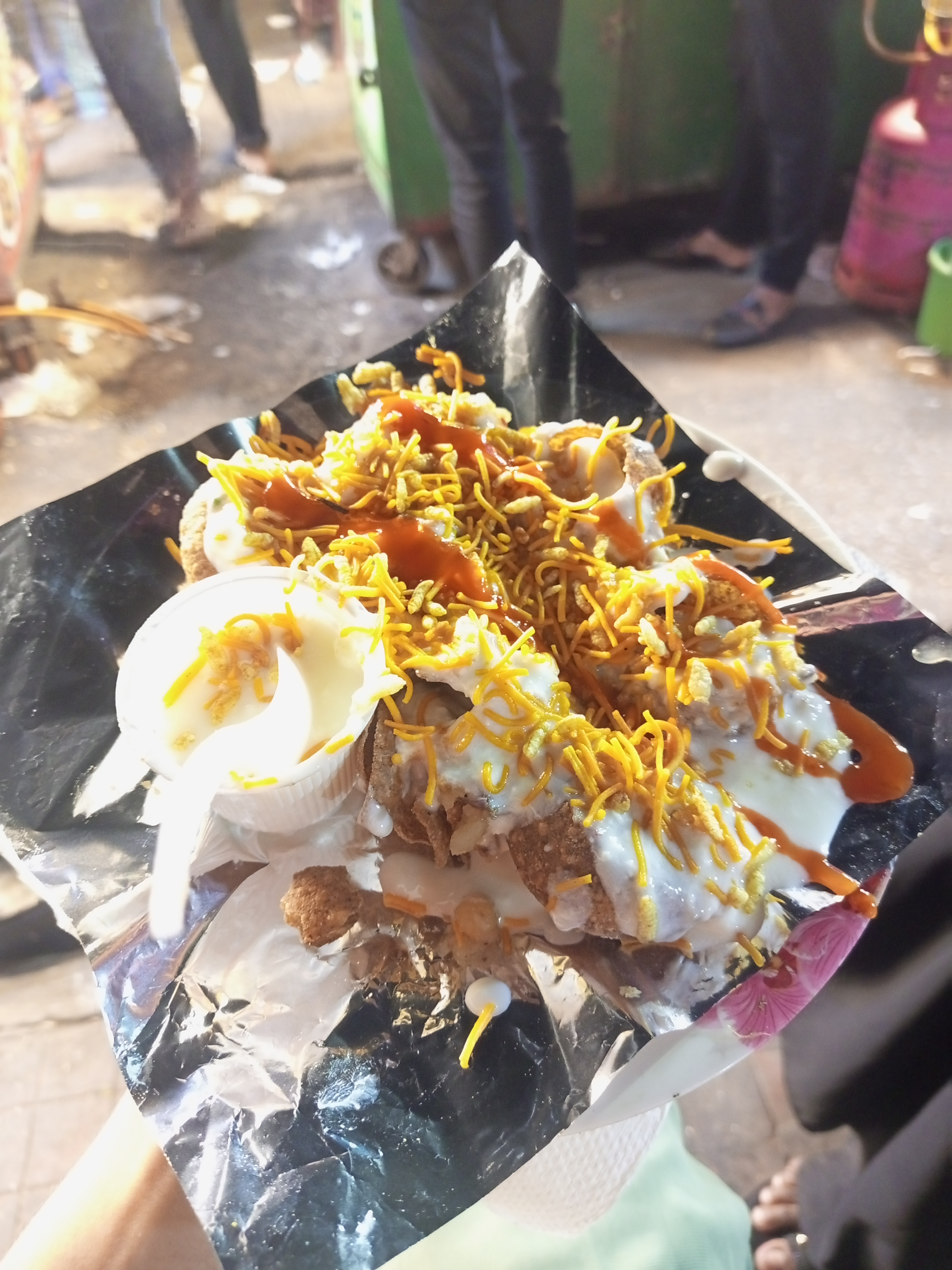Chaat | ["fried dough","yogurt","sweet sauce","spices","crispy noodles"] | ["fried dough:150g","yogurt:50g","sauce:30g","spices:20g"] | |