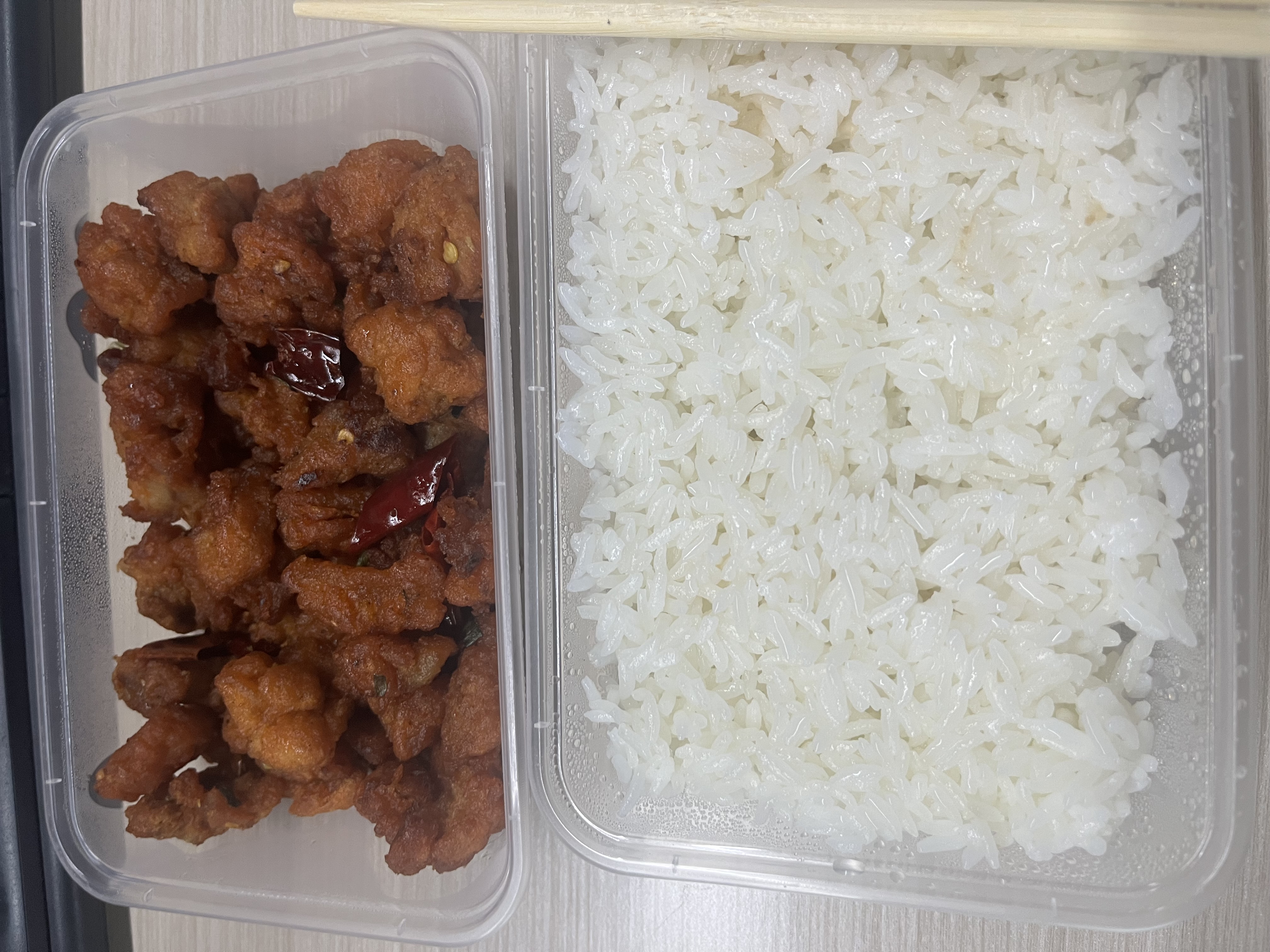 Fried Chicken with Rice | ["fried chicken","rice","spices"] | ["fried chicken:300g","rice:200g"] | |