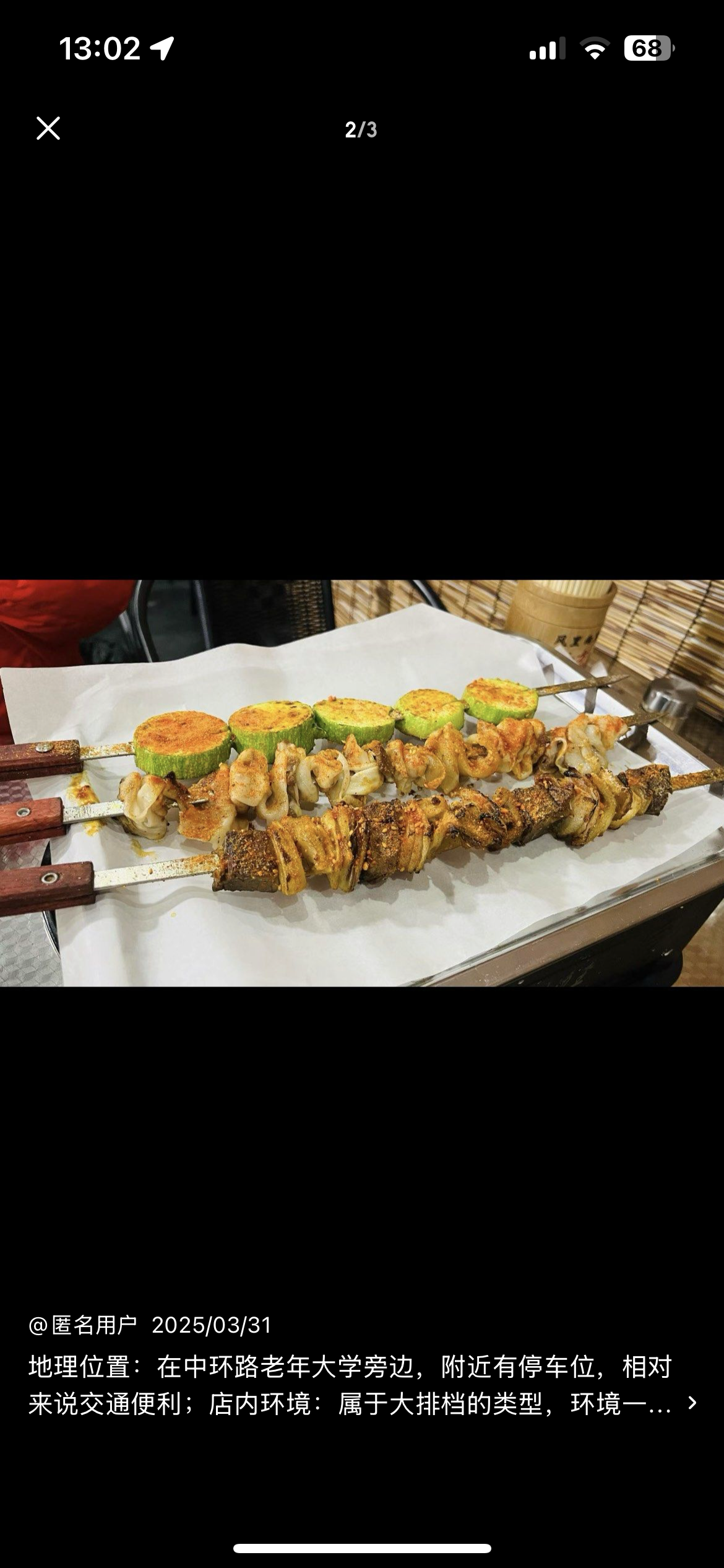 Grilled Skewers | ["chicken","beef","green onions","spices"] | ["meat:300g","vegetables:100g"] | |