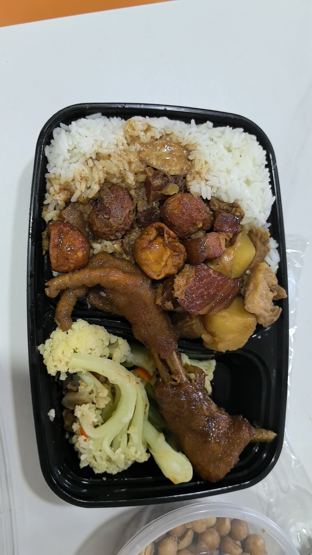 Chicken Rice | ["rice","chicken","sausage","fried onions","carrots","pickled vegetables"] | ["rice:200g","chicken:150g","sausage:50g","vegetables:100g"] | |