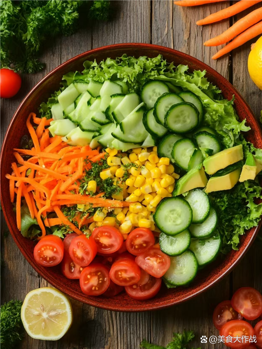 Vegetable Salad | ["cucumber","carrot","corn","tomato","avocado","lettuce"] | ["cucumber:100g","carrot:50g","corn:50g","tomato:100g","avocado:50g","lettuce:50g"] | |
