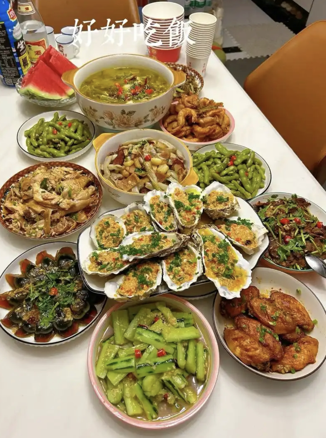 Mixed Chinese Dishes | ["shrimp","oysters","chicken","green beans","watermelon"] | ["seafood:300g","vegetables:200g","meat:200g"] | |