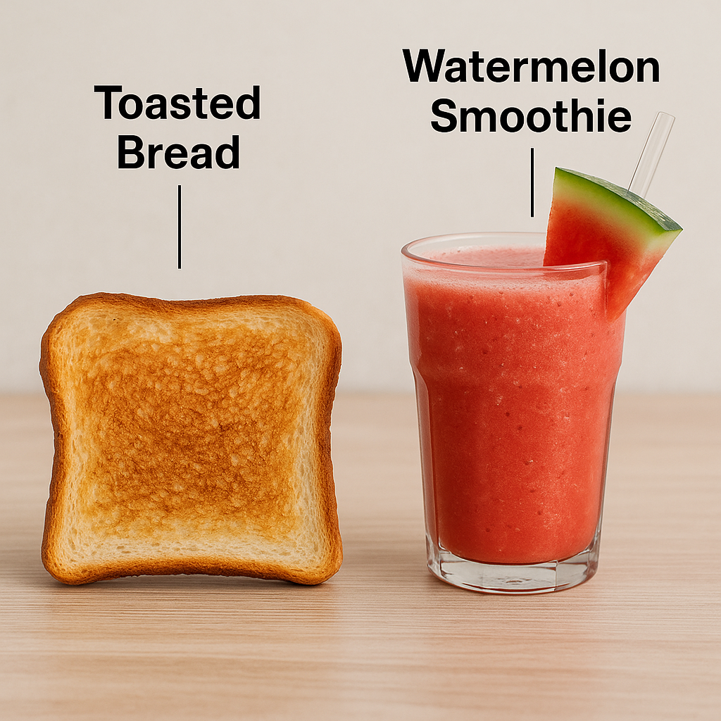 Toasted Bread with Watermelon Smoothie | ["toasted bread","watermelon","sugar","ice"] | ["toasted bread:50g","watermelon smoothie:250g"] | |