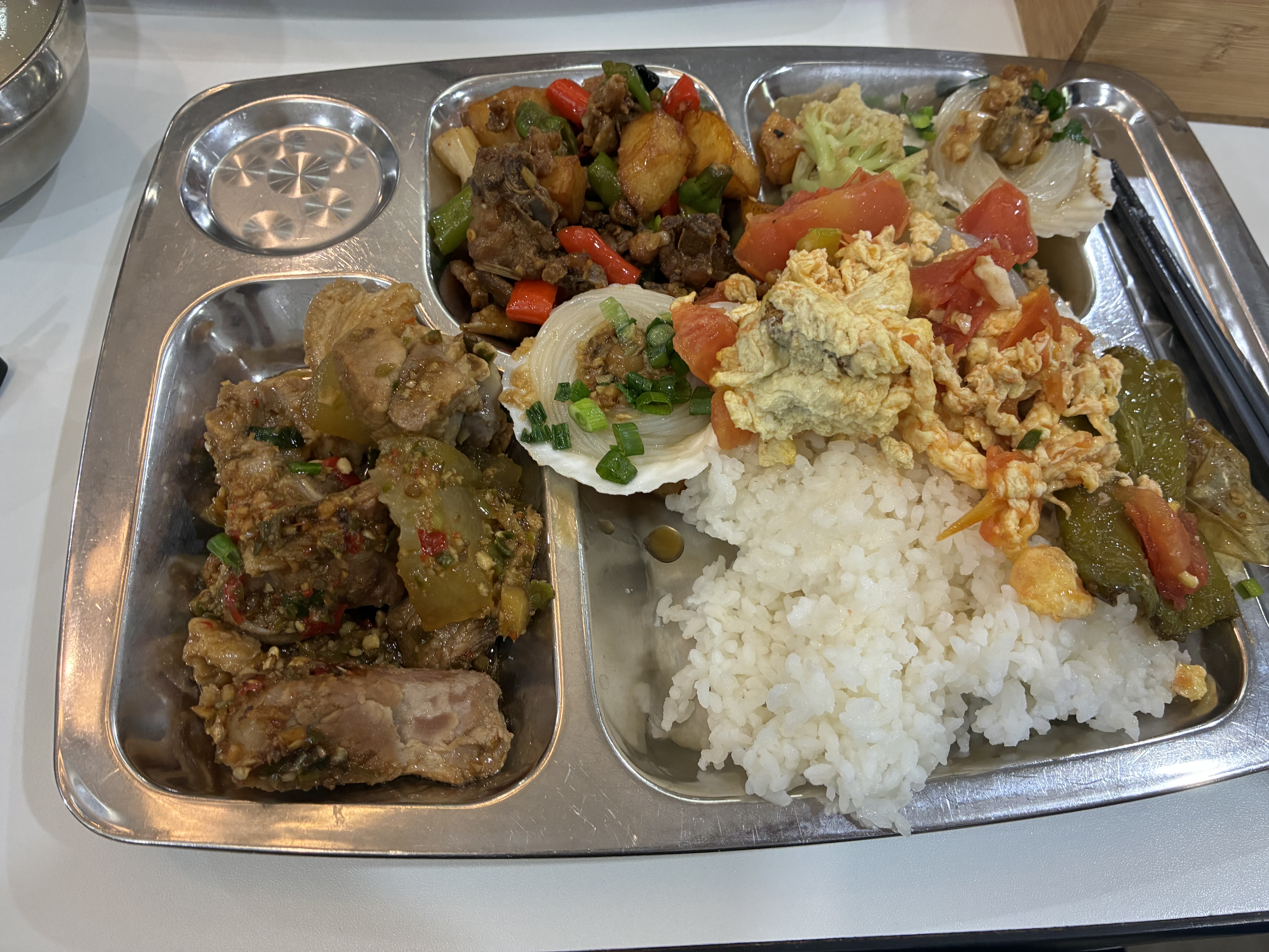 Chicken Curry with Rice | ["rice","chicken","potato","spices","condiment"] | ["rice:200g","chicken:150g","potato:100g","condiment:50g"] | |