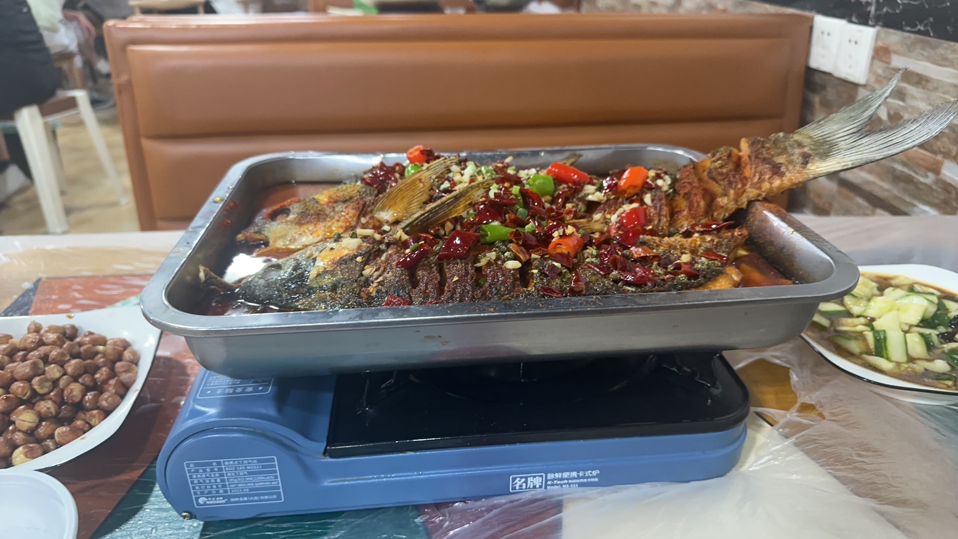 Spicy Fish | ["fish","spices","peppers","nuts"] | ["fish:400g","sauce:50g","side nuts:100g"] | |