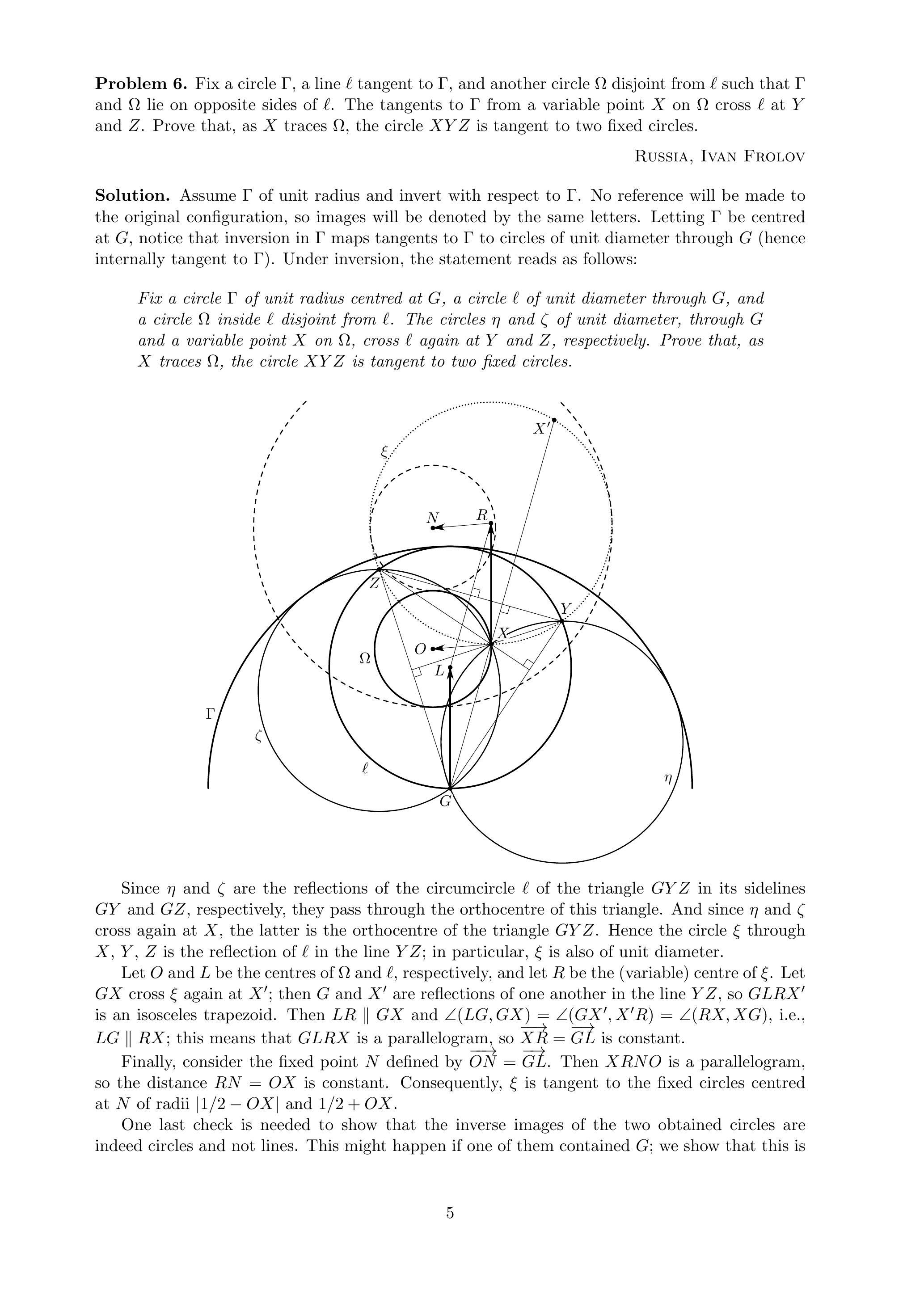 this shows that $G$ is necessarily outside the obtained circles. Remarks. (1) The last check could be omitted, if we allowed in the problem statement to regard a line as a particular case of a circle. On the other hand, the Problem Selection Committee suggests not to punish students who have not performed this check. (2) Notice that the required fixed circles are also tangent to $\Omega$.