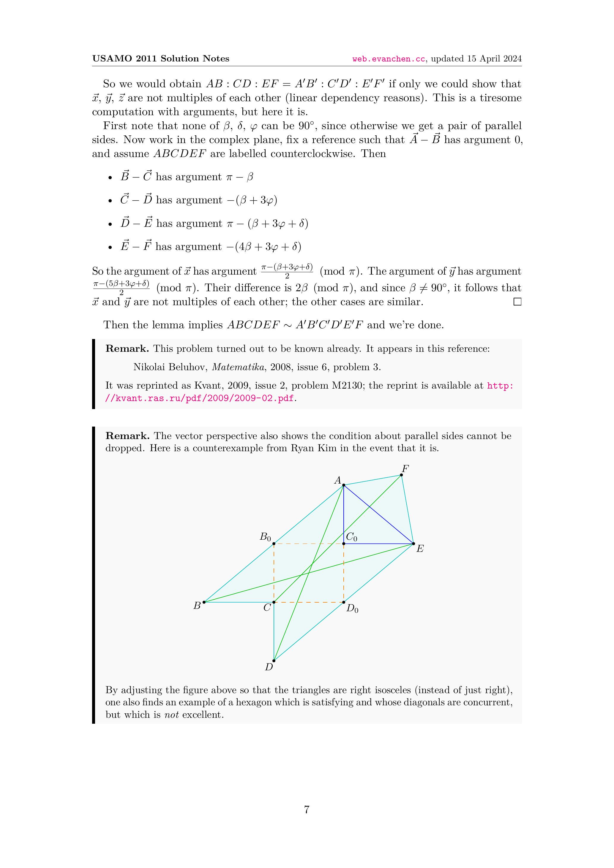 Then the lemma implies $A B C D E F \sim A^{\prime} B^{\prime} C^{\prime} D^{\prime} E^{\prime} F$ and we're done. Remark. This problem turned out to be known already. It appears in this reference: Nikolai Beluhov, Matematika, 2008, issue 6, problem 3. It was reprinted as Kvant, 2009, issue 2, problem M2130; the reprint is available at http: //kvant.ras.ru/pdf/2009/2009-02.pdf.