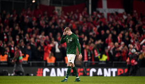 A man is standing on the field with his head in his hands. | On 18 November 2019, during the UEFA EURO2020 Qualifier match between Republic of Ireland and Denmark at the Aviva Stadium in Dublin, James McClean of Republic of Ireland is seen reacting with his head in his hands, as captured in a photo by Harry Murphy/Sportsfile. | 18 November 2019; James McClean of Republic of Ireland reacts during the UEFA EURO2020 Qualifier match between Republic of Ireland and Denmark at the Aviva Stadium in Dublin. Photo by Harry Murphy/Sportsfile | 000001177 | success | null | 256 | 256 | 180 | 110 | {} | 5f20094132f42db89fe8a94aec3a405b65eb643085e7c39786395fe0ae49aea0 | |