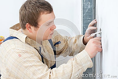 A man in overalls fixing a door handle. | A worker in overalls is installing a power socket in the wall while also fixing a door handle. | Worker installing power socket in wall | 000000842 | success | null | 256 | 256 | 400 | 268 | {"Image XResolution": "72", "Image YResolution": "72", "Image ResolutionUnit": "Pixels/Inch", "Image YCbCrPositioning": "Centered", "Image Copyright": "Artiomp | Dreamstime.com"} | 82fb40ff325edb4267a0bf5b52be0cf3d17df1034fe8dd3f353fb381dc2e517e | |