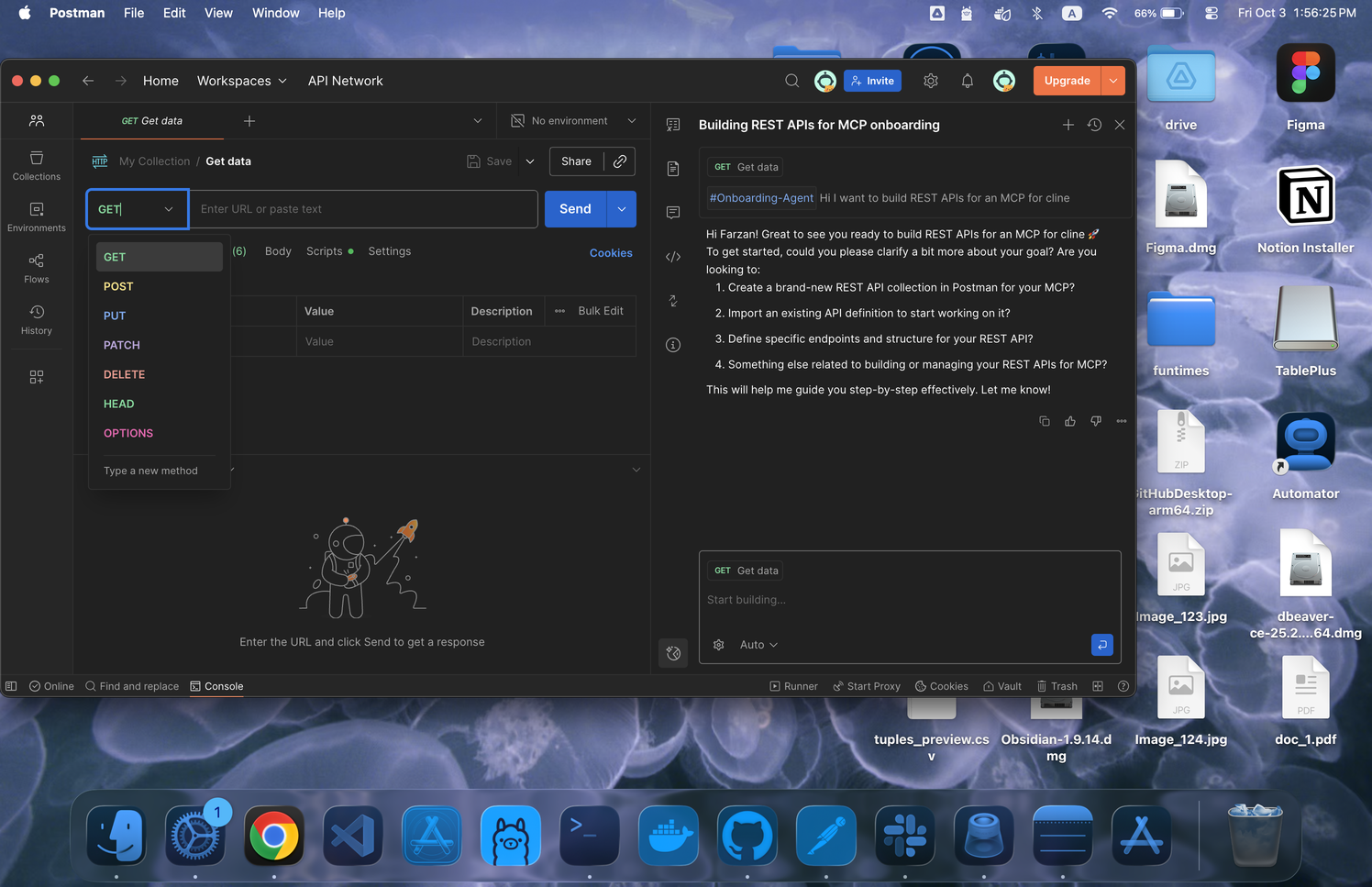 38 | mac | 1,496 | 967 | click | the text input field displaying "Start building..." placeholder text at the bottom of the AI helper chat panel on the right side of the Postman window. Located inside the conversation box below the conversation messages, directly below the 'Get Data' chip within the text box and above the gear icon with an "Auto" dropdown to its right. | 764 | 634 | 1,221 | 634 | 1,221 | 696 | 764 | 696 | null | null | null | null | null | null | null | null | null | Target: the text input field displaying "Start building..." placeholder text at the bottom of the AI helper chat panel on the right side of the Postman window. Located inside the conversation box below the conversation messages, directly below the 'Get Data' chip within the text box and above the gear icon with an "Auto" dropdown to its right. | |