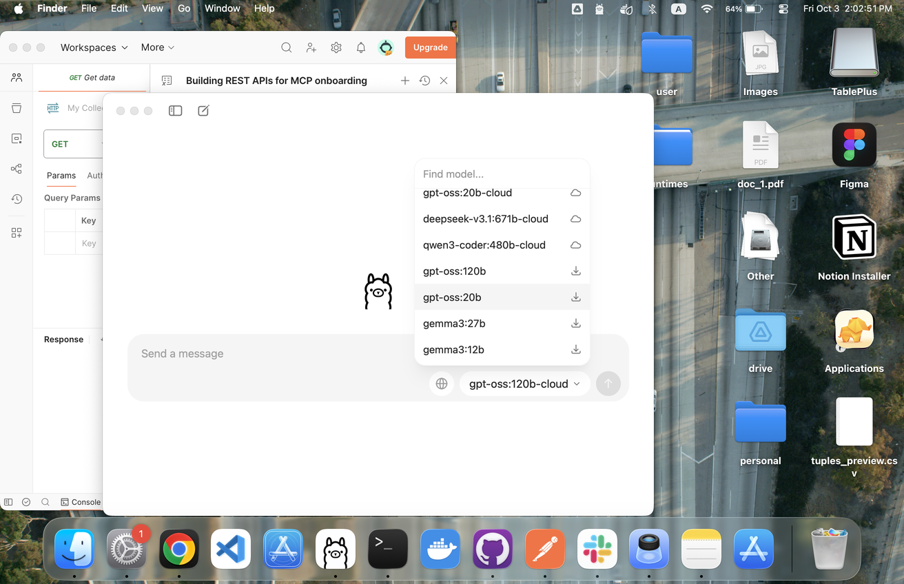 42 | mac | 1,312 | 848 | click | the text input field displaying "Send a message" placeholder text at the bottom of the Ollama window. Located behind the model list dropdown and below the black llama icon, with a globe icon and a model dropdown selector on its bottom-right. | 204 | 505 | 600 | 505 | 600 | 520 | 204 | 520 | null | null | null | null | null | null | null | null | null | Target: the text input field displaying "Send a message" placeholder text at the bottom of the Ollama window. Located behind the model list dropdown and below the black llama icon, with a globe icon and a model dropdown selector on its bottom-right. | |