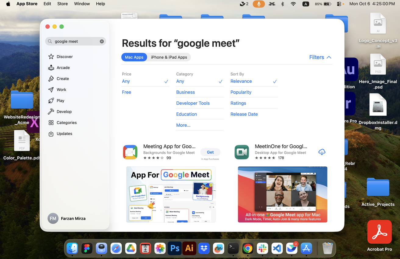 67 | mac | 1,312 | 848 | click | the "Get" button with blue text on light gray background with "In-App Purchases" label below it for installing the "Meeting App for Goo..." application showing 99 reviews with 4 stars. Located in the first app listing on the left side of the search results, to the right of the app icon showing a white video camera symbol surrounded by a thick colored frame border (red on left, blue on top, yellow at the bottom, green on right) inside the Mac App Store search results window. | 660 | 485 | 722 | 485 | 722 | 511 | 660 | 511 | null | null | null | null | null | null | null | null | null | Target: the "Get" button with blue text on light gray background with "In-App Purchases" label below it for installing the "Meeting App for Goo..." application showing 99 reviews with 4 stars. Located in the first app listing on the left side of the search results, to the right of the app icon showing a white video camera symbol surrounded by a thick colored frame border (red on left, blue on top, yellow at the bottom, green on right) inside the Mac App Store search results window. | |