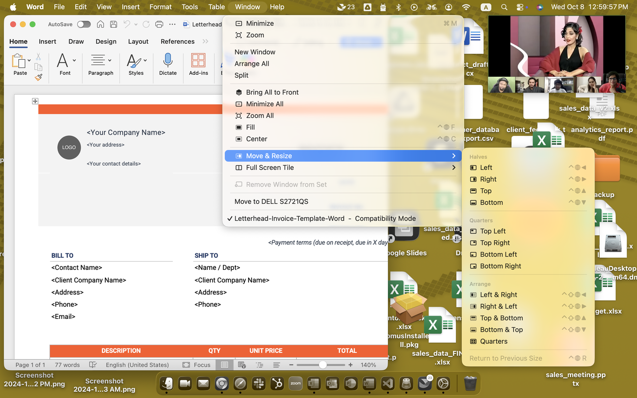 91 | mac | 1,312 | 820 | click | the "Quarters" option in the expanded Move & Resize submenu, displayed as text in the list of available Arrange section options. Located towards the bottom of the Arrange section, positioned below "Bottom & Top" and above the greyed out "Return to Previous Size" in the cascading menu from Window > Move & Resize. | 952 | 693 | 1,217 | 693 | 1,217 | 718 | 952 | 718 | null | null | null | null | null | null | null | null | null | Target: the "Quarters" option in the expanded Move & Resize submenu, displayed as text in the list of available Arrange section options. Located towards the bottom of the Arrange section, positioned below "Bottom & Top" and above the greyed out "Return to Previous Size" in the cascading menu from Window > Move & Resize. | |